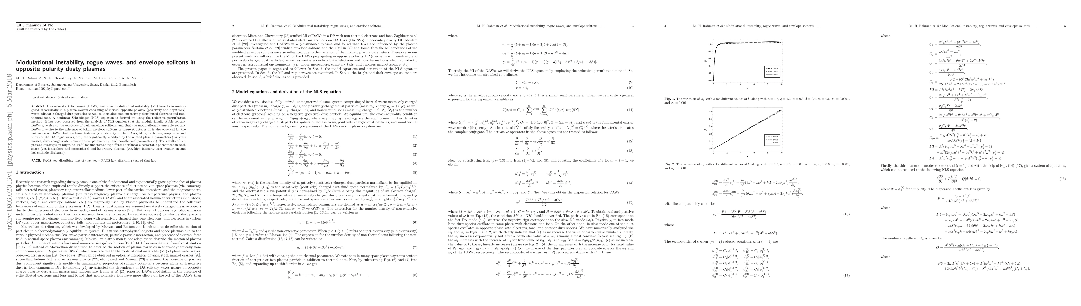Dust-acoustic (DA) waves (DAWs) and their modulational instability (MI) have been investigated theoretically in a plasma system consisting of inertial opposite polarity (positively and negatively) warm adiabatic charged dust particles as well as inertialess non-extensive $q$-distributed electrons and non-thermal ions. A nonlinear Schr\"{o}dinger (NLS) equation is derived by using the reductive perturbation method. It has been observed from the analysis of NLS equaion that the modulationally stable solitary DAWs give rise to the existence of dark envelope solitons, and that the modulationally unstable solitary DAWs give rise to the existence of bright envelope solitons or rogue structures. It is also observed for the fast mode of DAWs that the basic features (viz. stability of the DAWs, MI growth rate, amplitude and width of the DA rogue waves, etc.) are significantly modified by the related plasma parameters (viz. dust masses, dust charge state, non-extensive parameter $q$, and non-thermal parameter $\alpha$). The results of our present investigation might be useful for understanding different nonlinear electrostatic phenomena in both space (viz. ionosphere and mesosphere) and laboratory plasmas (viz. high intensity laser irradiation and hot cathode discharge).