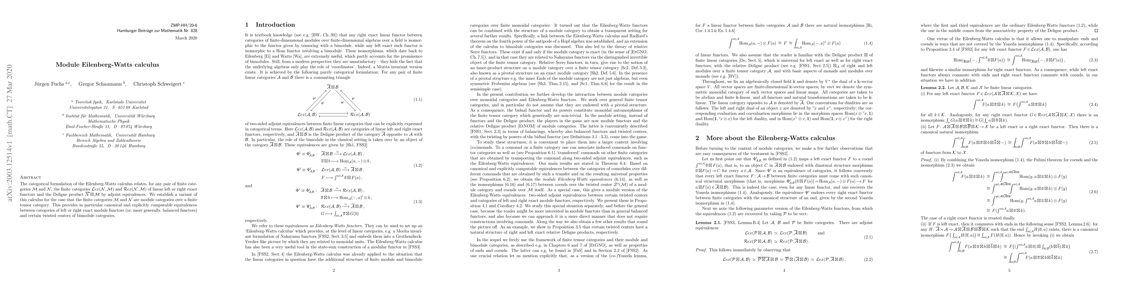 The paper establishes a categorical Eilenberg-Watts calculus for module categories over a finite tensor category, providing explicit equivalences between categories of exact module functors and twisted centers of bimodule categories. This variant extends the classical Eilenberg-Watts theorem to a more structured setting.