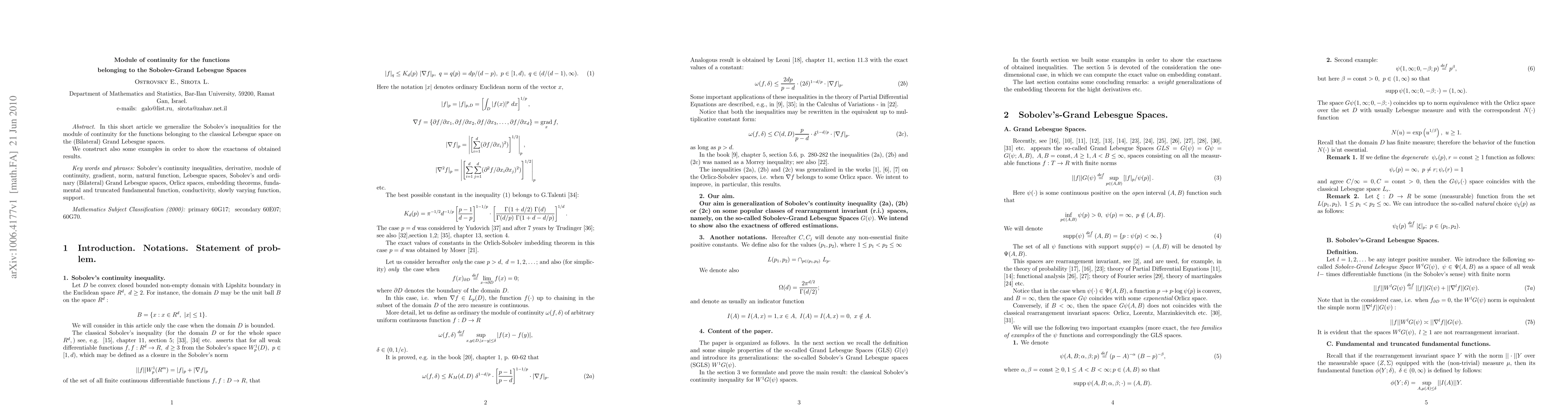 In this short article we generalize the Sobolev's inequalities for the module of continuity for the functions belonging to the classical Lebesgue space on the (Bilateral) Grand Lebesgue spaces. We construct also some examples in order to show the exactness of obtained results.