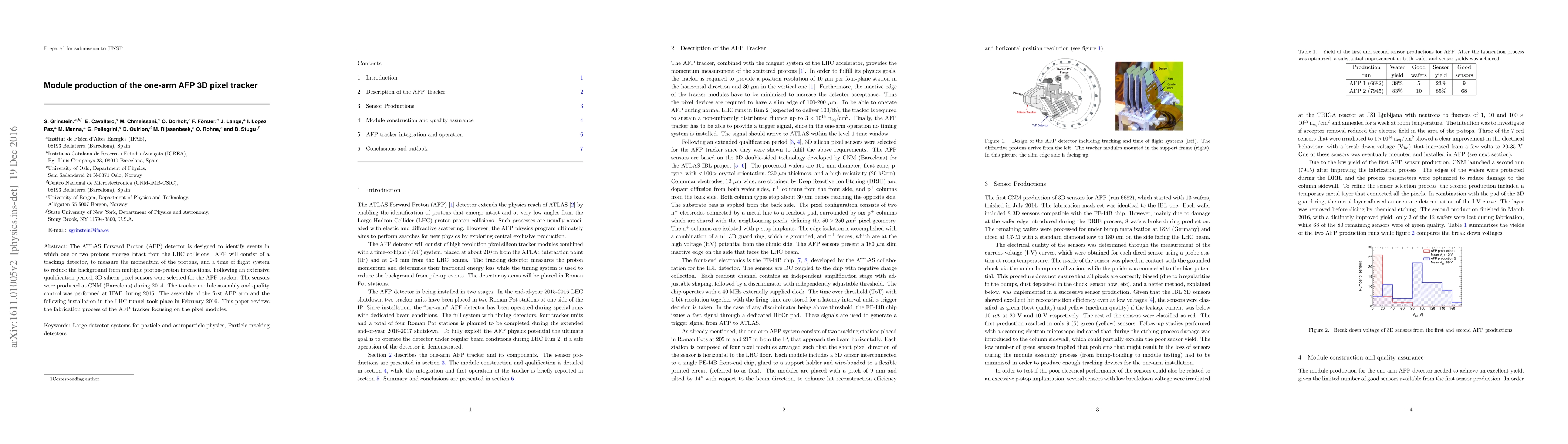 Researchers produced 3D silicon pixel sensors for the ATLAS Forward Proton detector, focusing on the fabrication process of the AFP tracker modules, which were assembled and installed in the LHC tunnel in 2016.