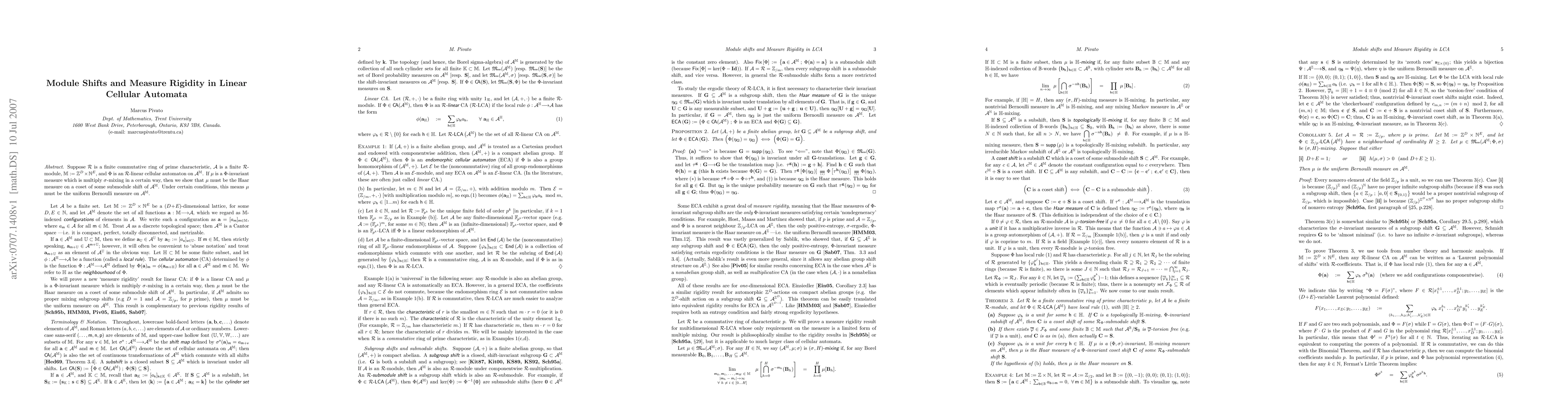 Suppose R is a finite commutative ring of prime characteristic, A is a finite R-module, M:=Z^D x N^E, and F is an R-linear cellular automaton on A^M. If mu is an F-invariant measure which is multiply shift-mixing in a certain way, then we show that mu must be the Haar measure on a coset of some submodule shift of A^M. Under certain conditions, this means mu must be the uniform Bernoulli measure on A^M.