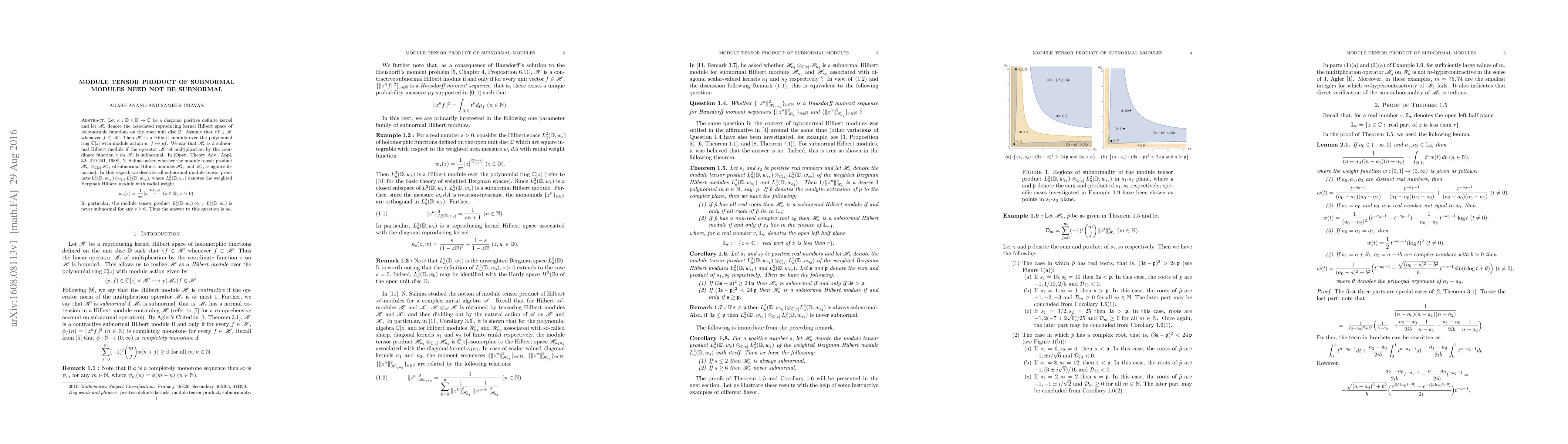 Let $\kappa : \mathbb D \times \mathbb D \to \mathbb C$ be a diagonal positive definite kernel and let $\mathscr H_{\kappa}$ denote the associated reproducing kernel Hilbert space of holomorphic functions on the open unit disc $\mathbb D$. Assume that $zf \in \mathscr H$ whenever $f \in \mathscr H.$ Then $\mathscr H$ is a Hilbert module over the polynomial ring $\mathbb C[z]$ with module action $p \cdot f \mapsto pf$. We say that $\mathscr H_{\kappa}$ is a subnormal Hilbert module if the operator $\mathscr M_{z}$ of multiplication by the coordinate function $z$ on $\mathscr H_{\kappa}$ is subnormal. %If $\kappa_1$ and $\kappa_2$ are two diagonal positive definite kernels then so is their pointwise (tensor) product $\kappa:=\kappa_1\kappa_2$. In [Oper. Theory Adv. Appl, 32: 219-241, 1988], N. Salinas asked whether the module tensor product $\mathscr H_{\kappa_1} \otimes_{\mathbb C[z]} \mathscr H_{\kappa_2}$ of subnormal Hilbert modules $\mathscr H_{\kappa_1}$ and $\mathscr H_{\kappa_2}$ is again subnormal. In this regard, we describe all subnormal module tensor products $L^2_a(\mathbb D, w_{s_1}) \otimes_{\mathbb C[z]} L^2_a(\mathbb D, w_{s_2})$, where $L^2_a(\mathbb D, w_s)$ denotes the weighted Bergman Hilbert module with radial weight $$w_s(z)=\frac{1}{s \pi}|z|^{\frac{2(1-s)}{s}}~(z \in \mathbb D, ~s > 0).$$ In particular, the module tensor product $L^2_a(\mathbb D, w_{s}) \otimes_{\mathbb C[z]} L^2_a(\mathbb D, w_{s})$ is never subnormal for any $s \geq 6$. Thus the answer to this question is no.