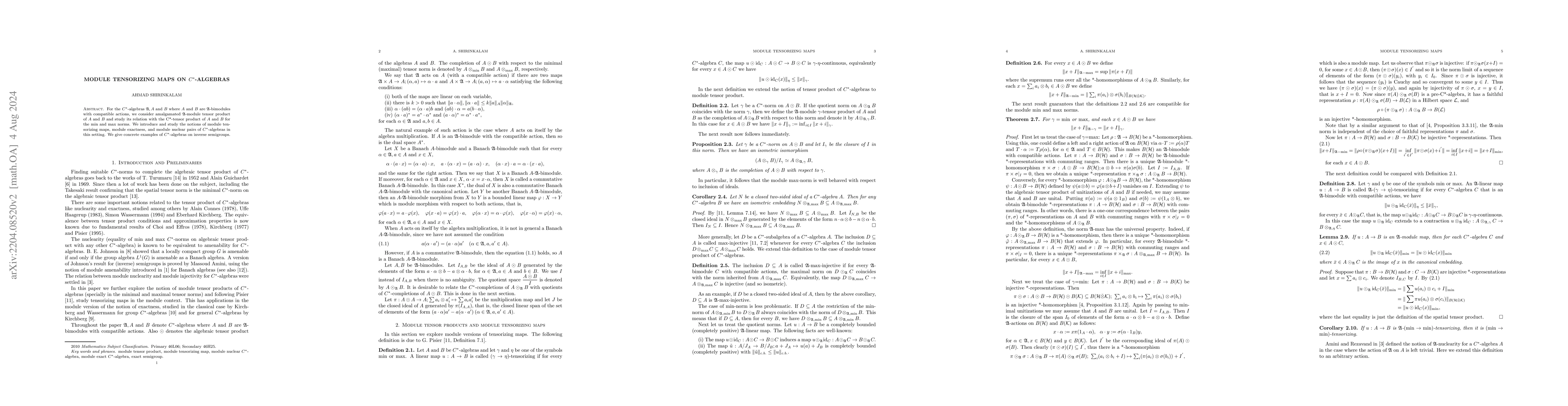 For $ C^*$-algebras $ \mathfrak{A}, A$ and $ B $ where $ A $ and $ B $ are $ \mathfrak{A} $-bimodules with compatible actions, we consider amalgamated $ \mathfrak{A} $-module tensor product of $ A $ and $ B $ and study its relation with the C*-tensor product of $A$ and $B$ for the min and max norms. We introduce and study the notions of module tensorizing maps, module exactness, and module nuclear pairs of $ C^*$-algebras in this setting. We give concrete examples of $C^*$-algebras on inverse semigroups.