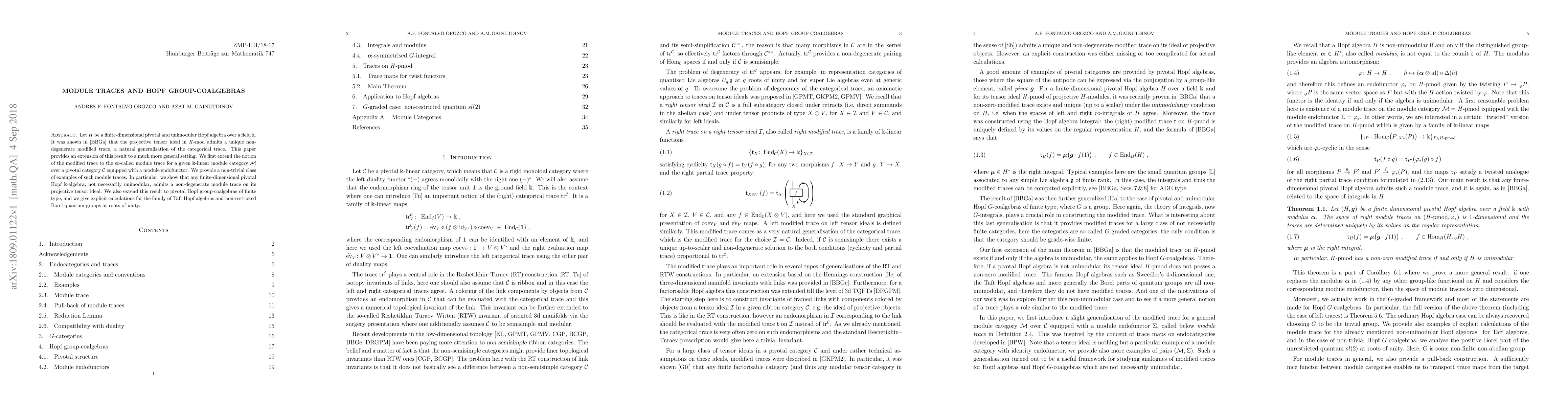 This paper extends the concept of modified trace from Hopf algebras to module traces for k-linear module categories over pivotal categories, demonstrating that non-unimodular Hopf algebras and pivotal Hopf group-coalgebras admit non-degenerate module traces, with specific calculations for Taft Hopf algebras and quantum groups.