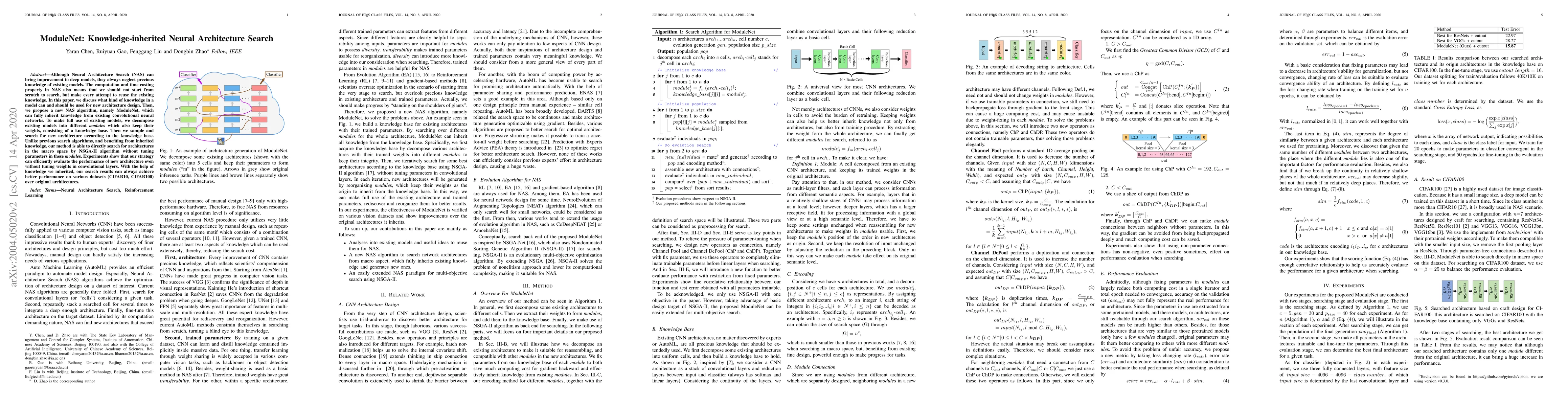 Although Neural Architecture Search (NAS) can bring improvement to deep models, they always neglect precious knowledge of existing models. The computation and time costing property in NAS also means that we should not start from scratch to search, but make every attempt to reuse the existing knowledge. In this paper, we discuss what kind of knowledge in a model can and should be used for new architecture design. Then, we propose a new NAS algorithm, namely ModuleNet, which can fully inherit knowledge from existing convolutional neural networks. To make full use of existing models, we decompose existing models into different \textit{module}s which also keep their weights, consisting of a knowledge base. Then we sample and search for new architecture according to the knowledge base. Unlike previous search algorithms, and benefiting from inherited knowledge, our method is able to directly search for architectures in the macro space by NSGA-II algorithm without tuning parameters in these \textit{module}s. Experiments show that our strategy can efficiently evaluate the performance of new architecture even without tuning weights in convolutional layers. With the help of knowledge we inherited, our search results can always achieve better performance on various datasets (CIFAR10, CIFAR100) over original architectures.