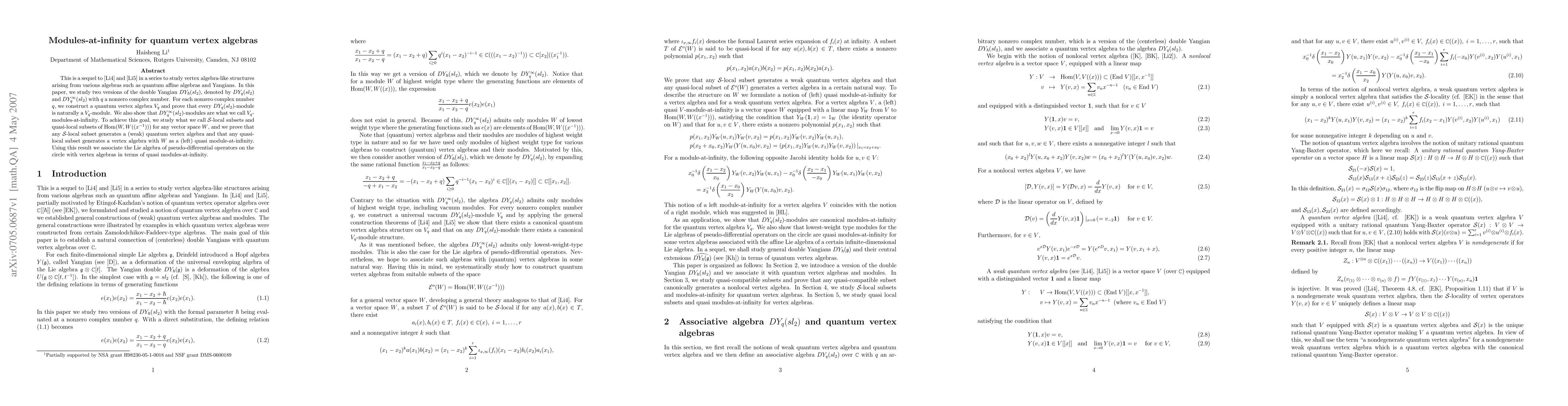 This is a sequel to \cite{li-qva1} and \cite{li-qva2} in a series to study vertex algebra-like structures arising from various algebras such as quantum affine algebras and Yangians. In this paper, we study two versions of the double Yangian $DY_{\hbar}(sl_{2})$, denoted by $DY_{q}(sl_{2})$ and $DY_{q}^{\infty}(sl_{2})$ with $q$ a nonzero complex number. For each nonzero complex number $q$, we construct a quantum vertex algebra $V_{q}$ and prove that every $DY_{q}(sl_{2})$-module is naturally a $V_{q}$-module. We also show that $DY_{q}^{\infty}(sl_{2})$-modules are what we call $V_{q}$-modules-at-infinity. To achieve this goal, we study what we call $\S$-local subsets and quasi-local subsets of $\Hom (W,W((x^{-1})))$ for any vector space $W$, and we prove that any $\S$-local subset generates a (weak) quantum vertex algebra and that any quasi-local subset generates a vertex algebra with $W$ as a (left) quasi module-at-infinity. Using this result we associate the Lie algebra of pseudo-differential operators on the circle with vertex algebras in terms of quasi modules-at-infinity.