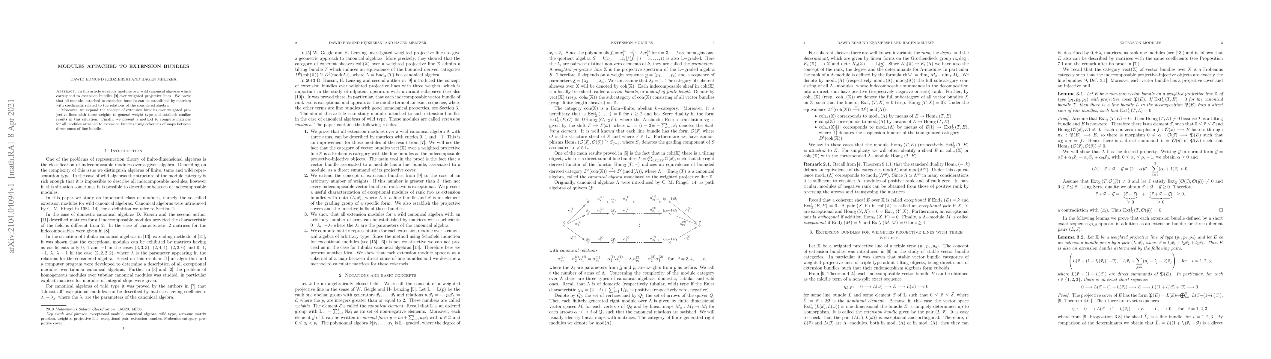 This paper investigates modules over wild canonical algebras corresponding to extension bundles over weighted projective lines, proving that these modules can be represented by matrices tied to the algebra's relations. The study extends the concept to general weight types and provides a method for computing matrices using cokernels of maps between line bundles.
