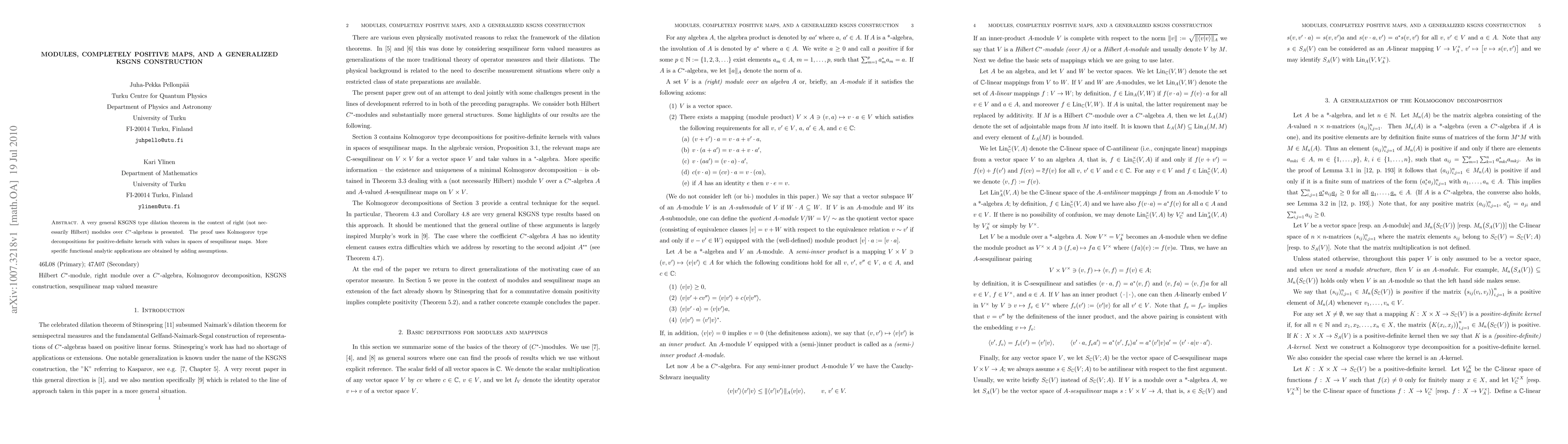 This paper presents a generalized KSGNS dilation theorem for right modules over $C^*$-algebras, employing Kolmogorov type decompositions for positive-definite kernels. Specific functional analytic applications arise under additional assumptions.
