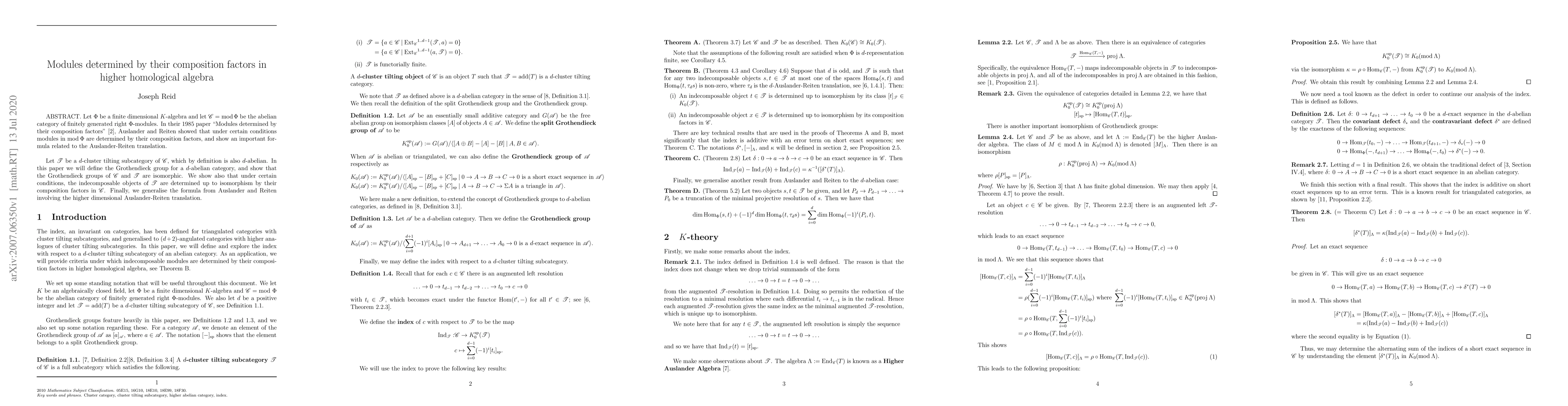 ABSTRACT. Let $\Phi$ be a finite dimensional $K$-algebra and let $\mathscr{C} = \textrm{mod}\: \Phi$ be the abelian category of finitely generated right $\Phi$-modules. In their 1985 paper ``Modules determined by their composition factors'', Auslander and Reiten showed that under certain conditions modules in $\textrm{mod}\: \Phi$ are determined by their composition factors, and show an important formula related to the Auslander-Reiten translation. Let $\mathscr{T}$ be a $d$-cluster tilting subcategory of $\mathscr{C}$, which by definition is also $d$-abelian. In this paper we will define the Grothendieck group for a $d$-abelian category, and show that the Grothendieck groups of $\mathscr{C}$ and $\mathscr{T}$ are isomorphic. We show also that under certain conditions, the indecomposable objects of $\mathscr{T}$ are determined up to isomorphism by their composition factors in $\mathscr{C}$. Finally, we generalise the formula from Auslander and Reiten involving the higher dimensional Auslander-Reiten translation.