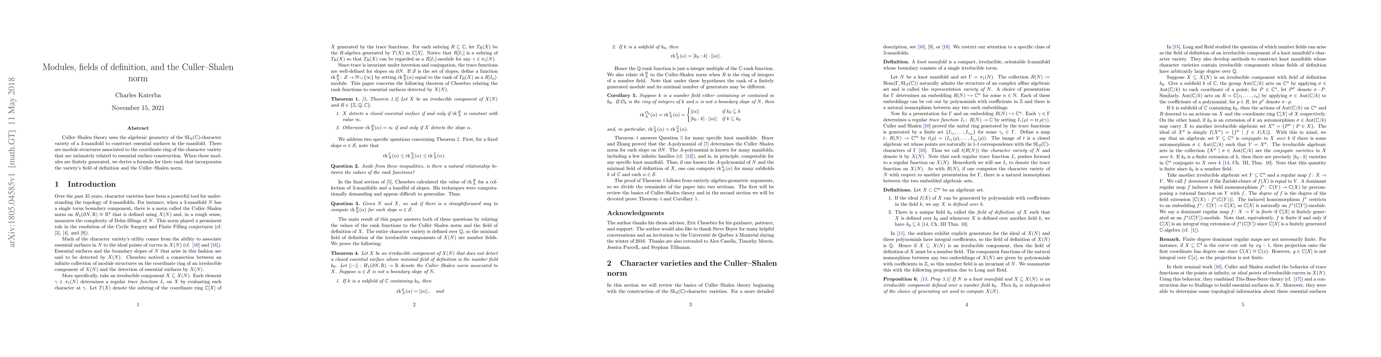 Culler-Shalen theory uses the algebraic geometry of the SL(2,C)-character variety of a 3-manifold to construct essential surfaces in the manifold. There are module structures associated to the coordinate rings of the irreducible components of character varieties that are intimately related to essential surface construction. When these modules are finitely generated, we derive a formula for their rank that incorporates the irreducible component's field of definition and the Culler-Shalen norm.