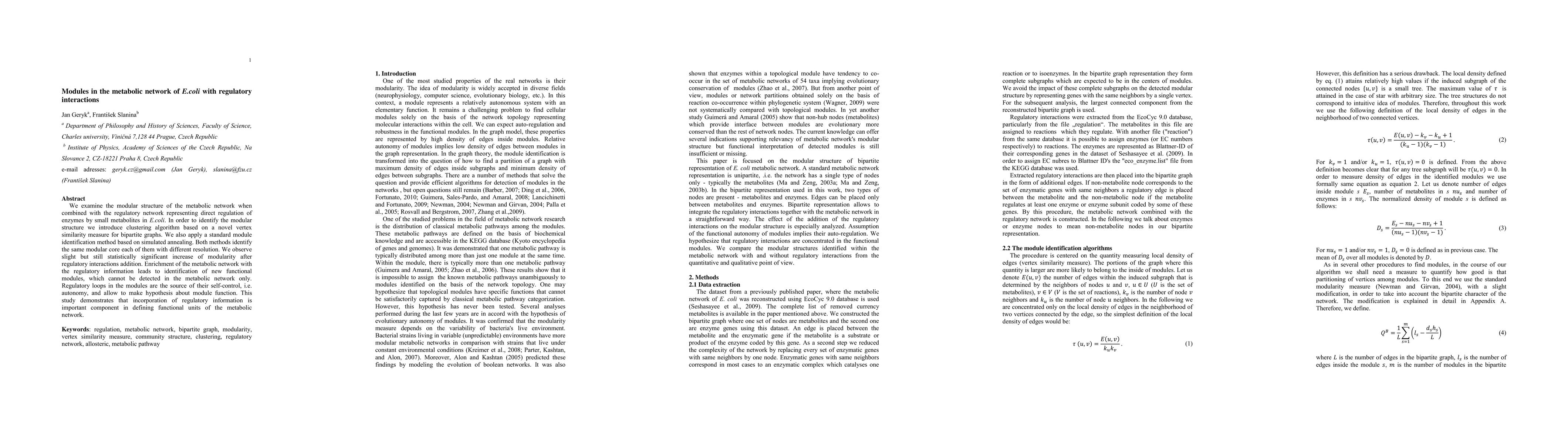 We examine the modular structure of the metabolic network when combined with the regulatory network representing direct regulation of enzymes by small metabolites in E.coli. In order to identify the modular structure we introduce clustering algorithm based on a novel vertex similarity measure for bipartite graphs. We also apply a standard module identification method based on simulated annealing. Both methods identify the same modular core each of them with different resolution. We observe slight but still statistically significant increase of modularity after regulatory interactions addition. Enrichment of the metabolic network with the regulatory information leads to identification of new functional modules, which cannot be detected in the metabolic network only. Regulatory loops in the modules are the source of their self-control, i.e. autonomy, and allow to make hypothesis about module function. This study demonstrates that incorporation of regulatory information is important component in defining functional units of the metabolic network.