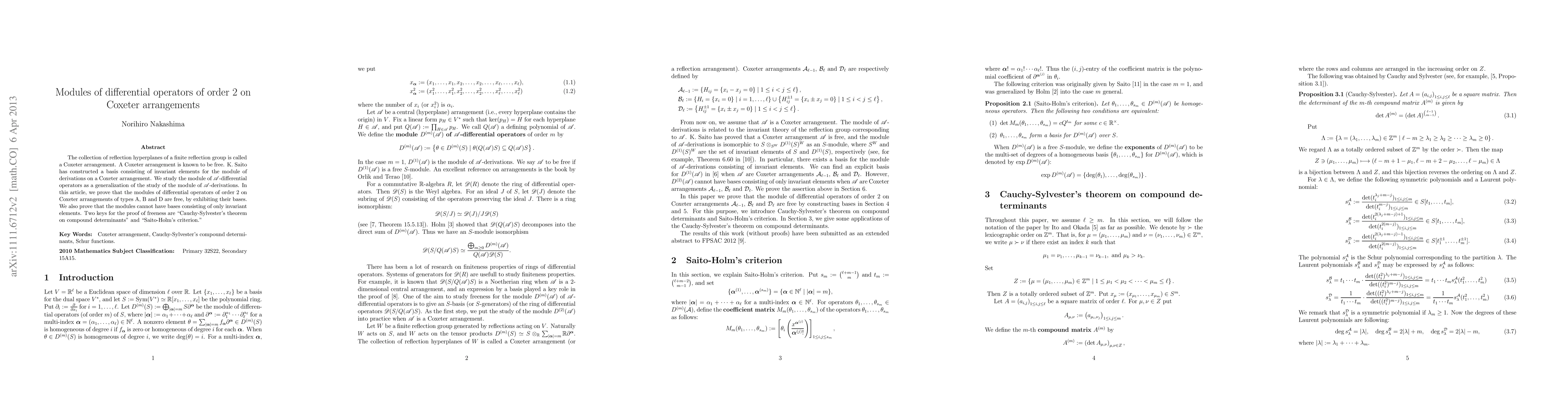 We prove that the modules of differential operators of order 2 on the classical Coxeter arrangements are free by exhibiting bases. For this purpose, we use Cauchy-Sylvester's theorem on compound determinants and Saito-Holm's criterion. In the case type $A$, we apply Cauchy-Sylvester's theorem on compound determinants to Vandermond determinant. By using the Schur polynomials, we define operators which form a part of a basis of modules of differential operators on the classical Coxeter arrangements of type $A$. In the cases of type $B$ and type $D$, the proofs go similarly to the case of type $A$ with some adjustments of operators and determinants.