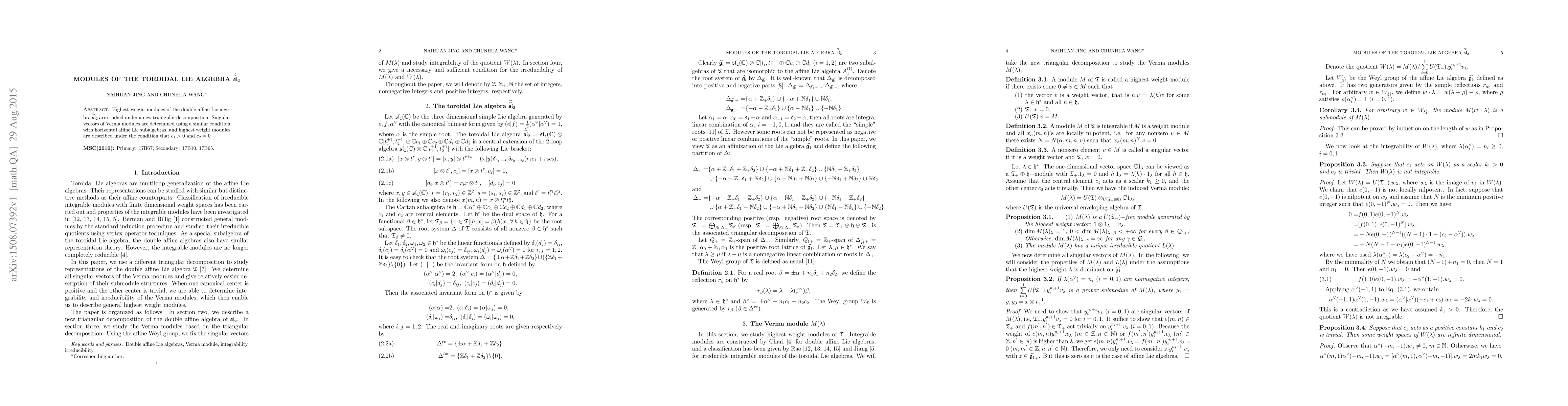 The paper investigates highest weight modules of the double affine Lie algebra $\widehat{\widehat{\mathfrak{sl}}}_{2}$ via a novel triangular decomposition, determining singular vectors in Verma modules and describing these modules under the condition $c_1>0$ and $c_2=0$.