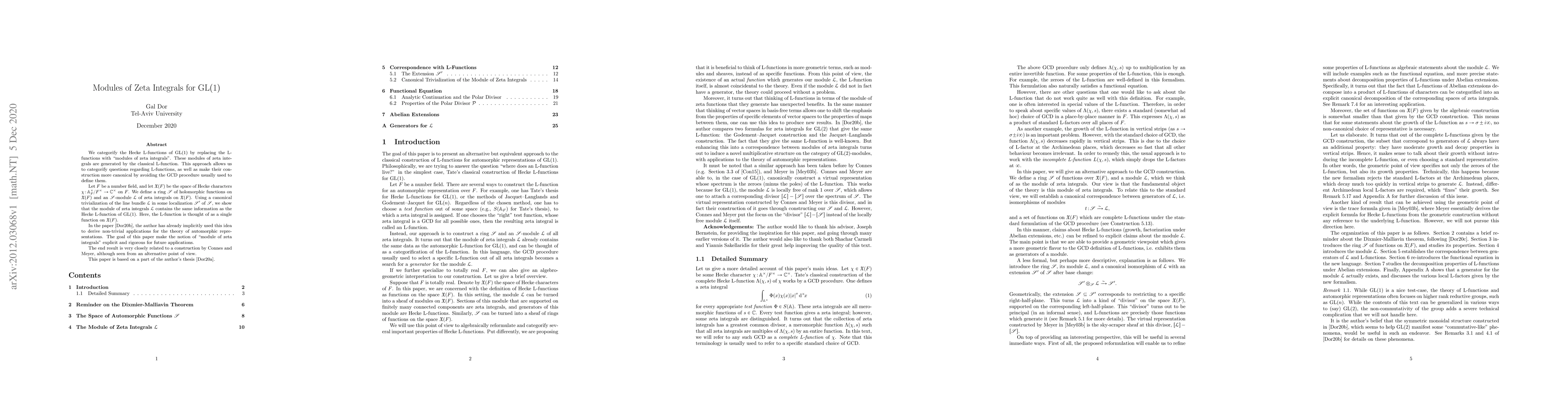 This paper introduces a rigorous framework for "modules of zeta integrals" to replace Hecke L-functions of $\mathrm{GL}(1)$, aiming to provide a more canonical construction and facilitate categorification of L-functions. The approach avoids the GCD procedure typically used, presenting potential for future applications in automorphic representations.
