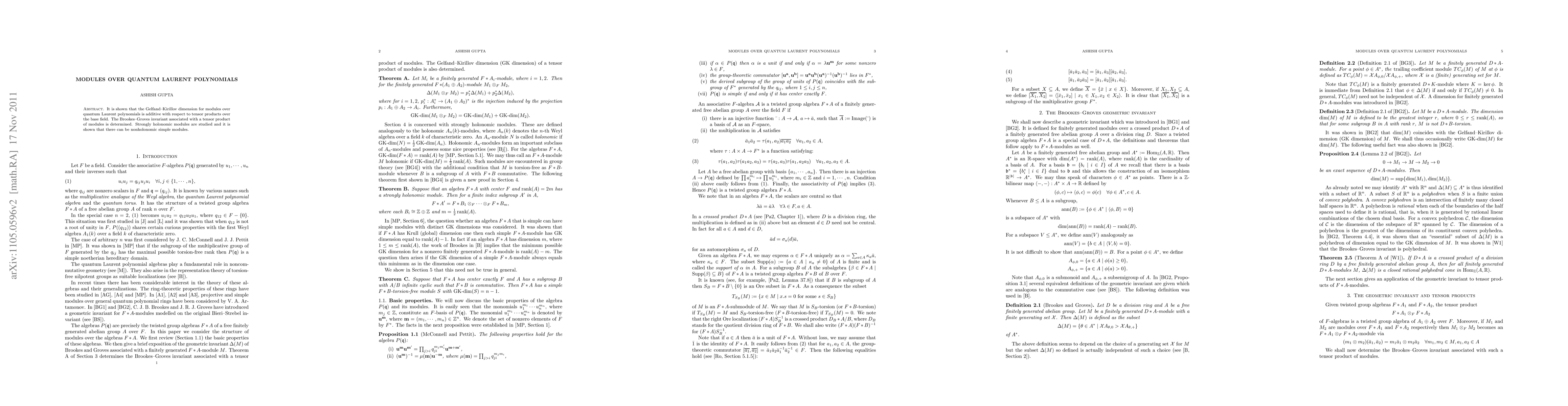 It is shown that the Gelfand--Kirillov dimension for modules over quantum Laurent polynomials is tensor-minimal. The Brookes--Groves invariant associated with a tensor product of modules is determined. It is also shown that there can be nonholonmic simple modules.