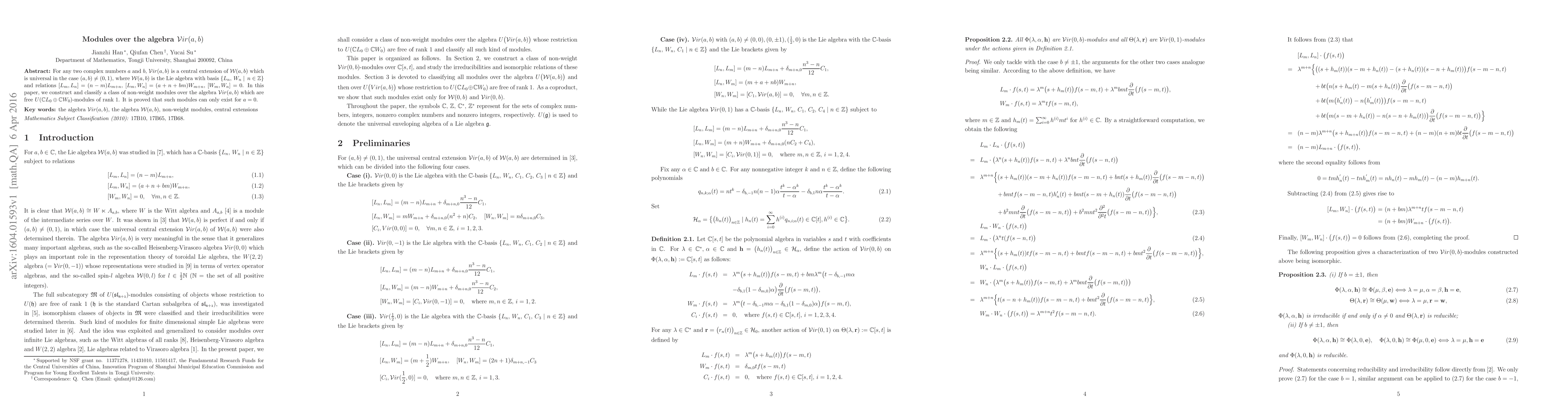 This paper constructs and classifies non-weight modules over the algebra $\mathcal{V} ir(a,b)$, showing they are free $U(\mathbb{C} L_0\oplus\mathbb{C} W_0)$-modules of rank $1$, and proves these modules only exist when $a=0$.