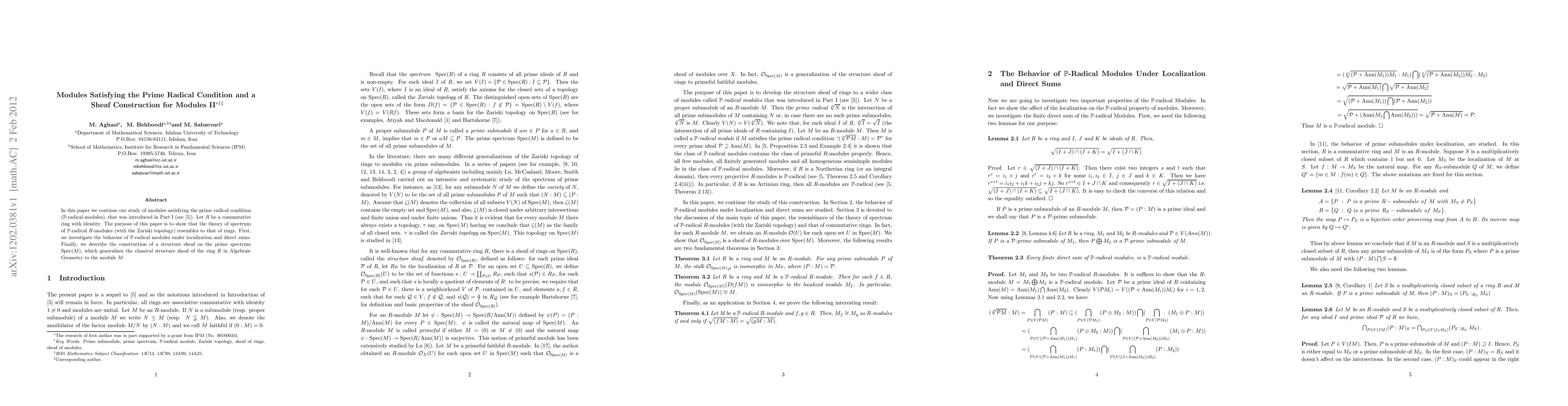 This paper explores how modules satisfying a specific condition ($ extit{prime radical}$) share similarities with ring theory, particularly in their behavior under localization and direct sums. It also introduces a new construction method for structure sheaves on prime spectra of these modules.