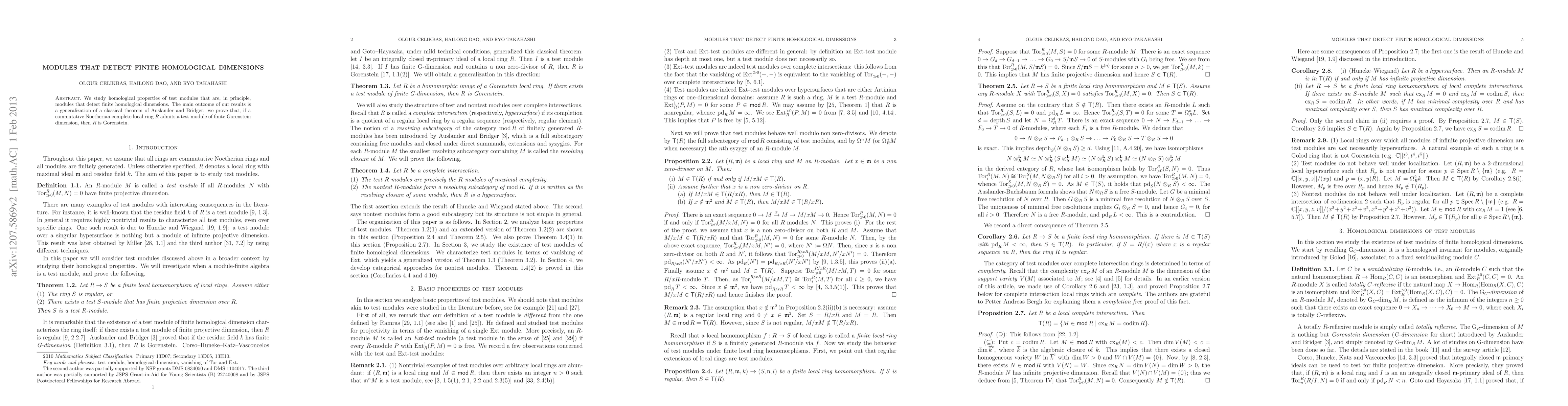 This paper explores homological properties of test modules that identify finite homological dimensions, leading to a generalization of a theorem by Auslander and Bridger. It proves that a commutative Noetherian complete local ring with a test module of finite Gorenstein dimension must itself be Gorenstein.