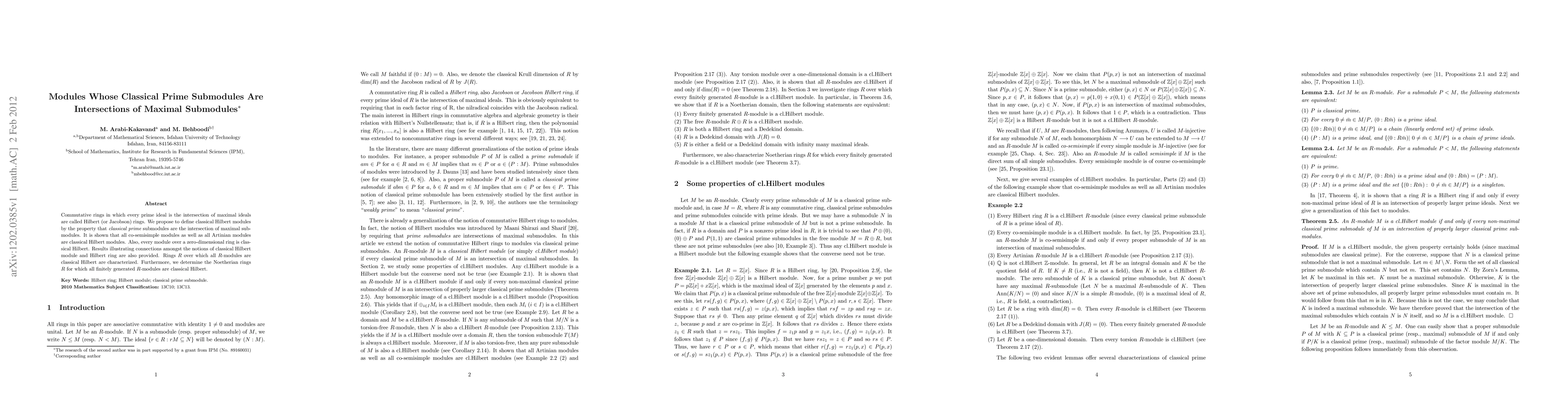 This paper explores the concept of classical Hilbert modules, where classical prime submodules are intersections of maximal submodules, and establishes that co-semisimple, Artinian modules, and modules over zero-dimensional rings are classical Hilbert modules. It also characterizes rings where all modules exhibit this property and determines Noetherian rings where all finitely generated modules are classical Hilbert.