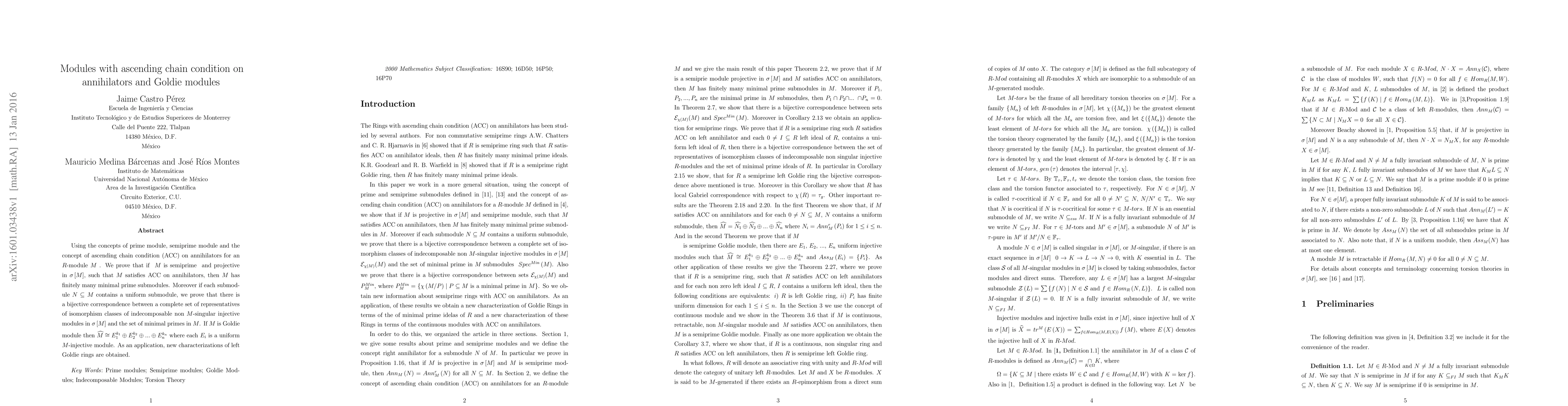 This paper proves that semiprime $R$-modules $M$ with an ascending chain condition on annihilators and projective in $\sigma \left[ M\right]$ have finitely many minimal prime submodules. It also establishes a bijective correspondence between indecomposable non $M$-singular injective modules and minimal primes when $M$ contains uniform submodules, and characterizes Goldie modules in terms of their injective hulls.