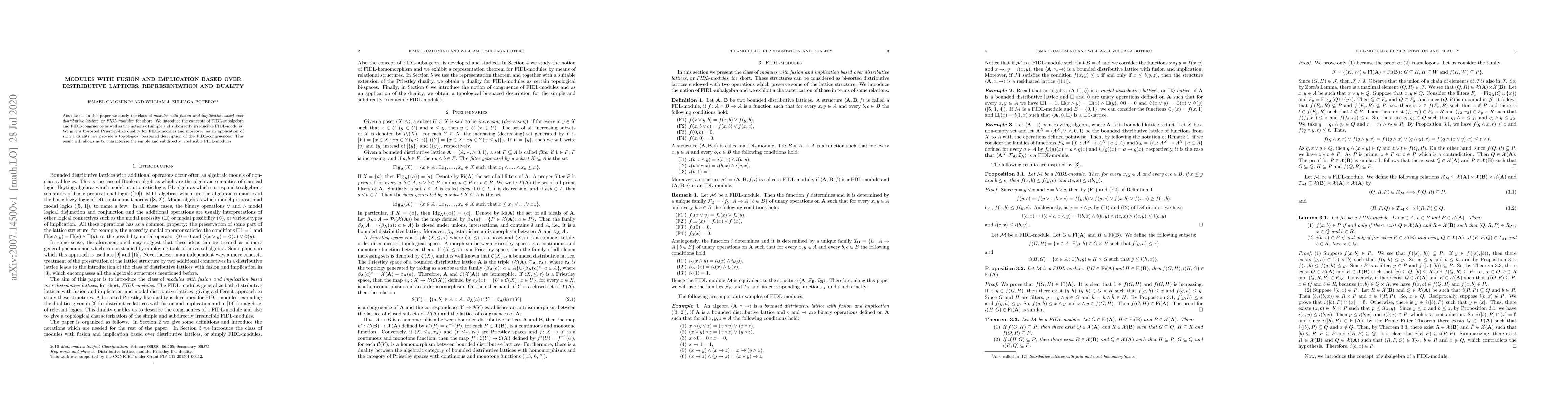 The paper studies modules with fusion and implication based over distributive lattices, introducing FIDL-subalgebras and FIDL-congruences, and providing a bi-sorted Priestley-like duality for FIDL-modules.