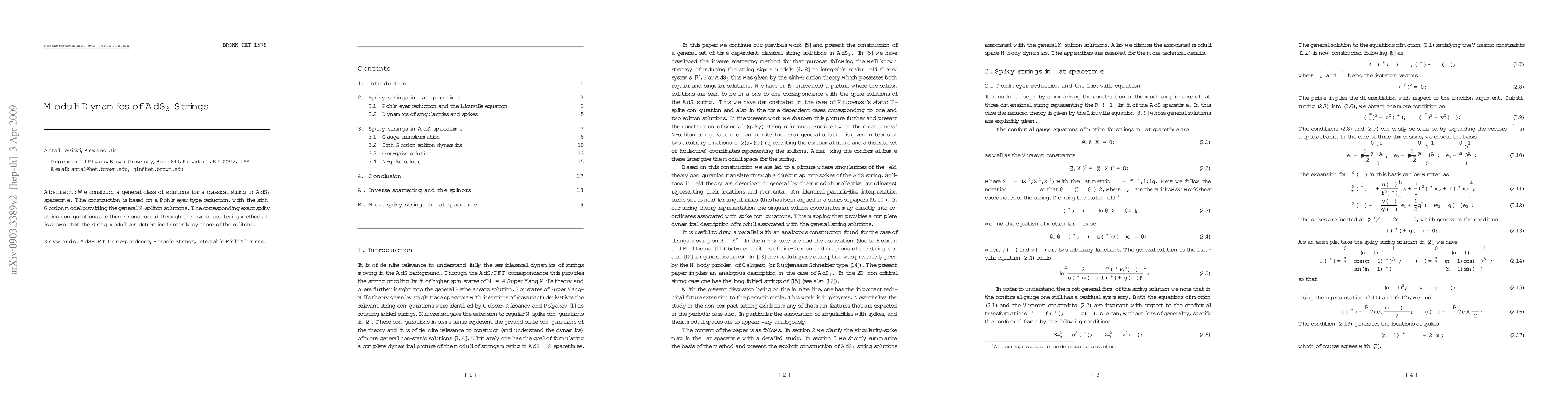 We construct a general class of solutions for a classical string in AdS_3 spacetime. The construction is based on a Pohlmeyer type reduction, with the sinh-Gordon model providing the general N-soliton solutions. The corresponding exact spiky string configurations are then reconstructed through the inverse scattering method. It is shown that the string moduli are determined entirely by those of the solitons.