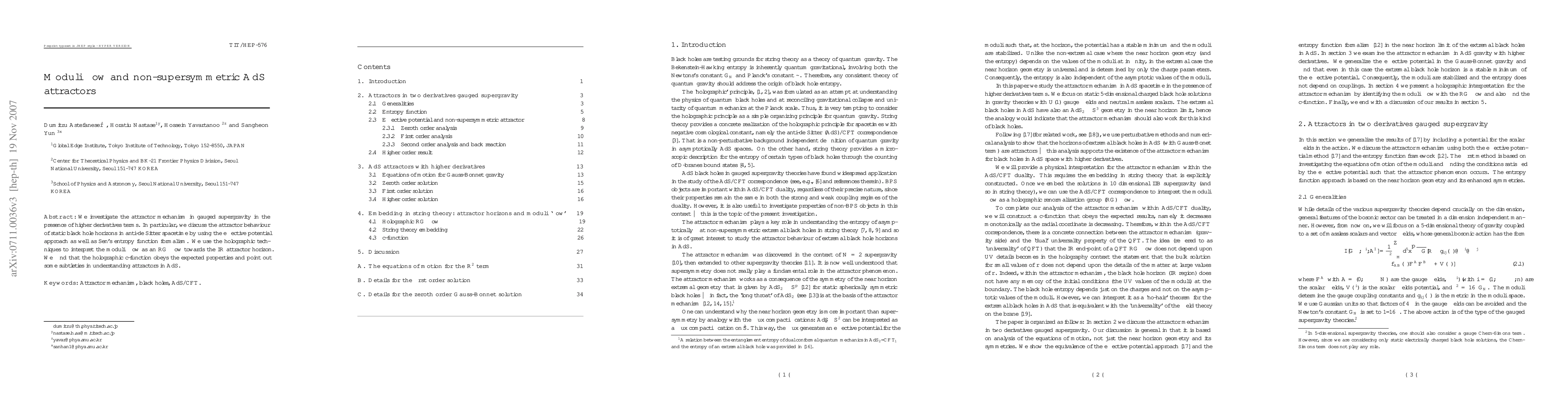 We investigate the attractor mechanism in gauged supergravity in the presence of higher derivatives terms. In particular, we discuss the attractor behaviour of static black hole horizons in anti-de Sitter spacetime by using the effective potential approach as well as Sen's entropy function formalism. We use the holographic techniques to interpret the moduli flow as an RG flow towards the IR attractor horizon. We find that the holographic c-function obeys the expected properties and point out some subtleties in understanding attractors in AdS.