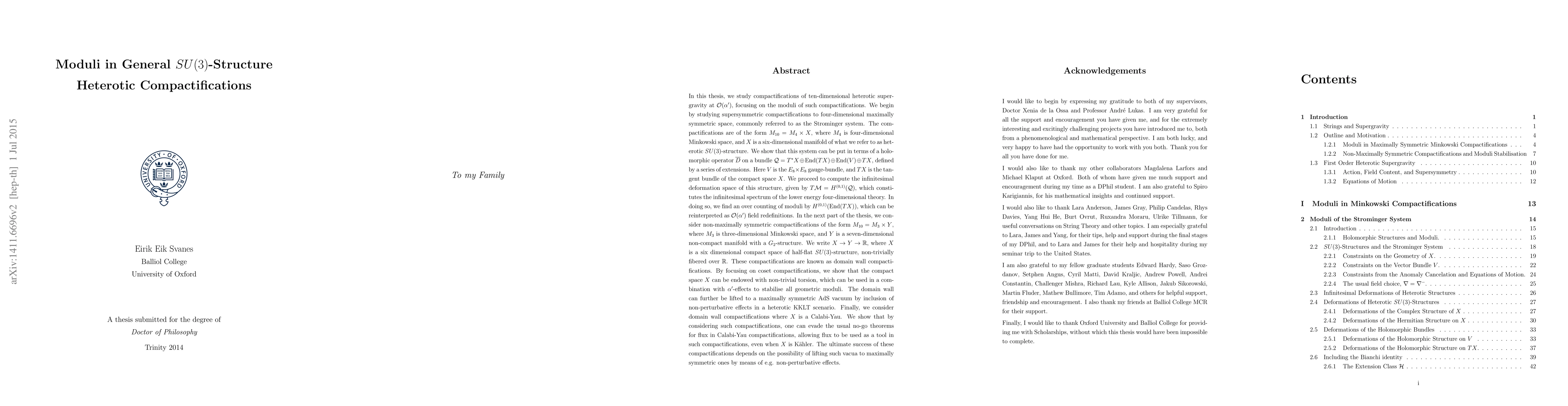 In this thesis, we study moduli in compactifications of ten-dimensional heterotic supergravity. We consider supersymmetric compactifications to four-dimensional maximally symmetric space, commonly referred to as the Strominger system. The compact part of space-time $X$ is a six-dimensional manifold of what we refer to as a heterotic $SU(3)$-structure. We show that this system can be put in terms of a holomorphic operator $\bar D$ on a bundle $\mathcal{Q}=T^*X\oplus\mathrm{End}(TX)\oplus\mathrm{End}(V)\oplus TX$, defined by a series of extensions. We proceed to compute the infinitesimal deformation space of this structure, given by $T\mathcal{M}=H^{(0,1)}(\mathcal{Q})$, which constitutes the infinitesimal spectrum of the four-dimensional theory. In doing so, we find an over counting of moduli by $H^{(0,1)}(\mathrm{End}(TX))$, which can be reinterpreted as $\mathcal{O}(\alpha')$ field redefinitions. We next consider non-maximally symmetric domain wall compactifications of the form $M_{10}=M_3\times Y$, where $M_3$ is three-dimensional Minkowski space, and $Y=\mathbb{R}\times X$ is a seven-dimensional non-compact manifold with a $G_2$-structure. Here $X$ is a six dimensional compact space of half-flat $SU(3)$-structure, non-trivially fibered over $\mathbb{R}$. By focusing on coset compactifications, we show that the compact space $X$ can be endowed with non-trivial torsion, which can be used in a combination with $\alpha'$-effects to stabilise all geometric moduli. The domain wall can further be lifted to a maximally symmetric AdS vacuum by inclusion of non-perturbative effects. Finally, we consider domain wall compactifications where $X$ is a Calabi-Yau. We show that by considering such compactifications, one can evade the usual no-go theorems for flux in Calabi-Yau compactifications, allowing flux to be used as a tool in such compactifications, even when $X$ is K\"ahler.
