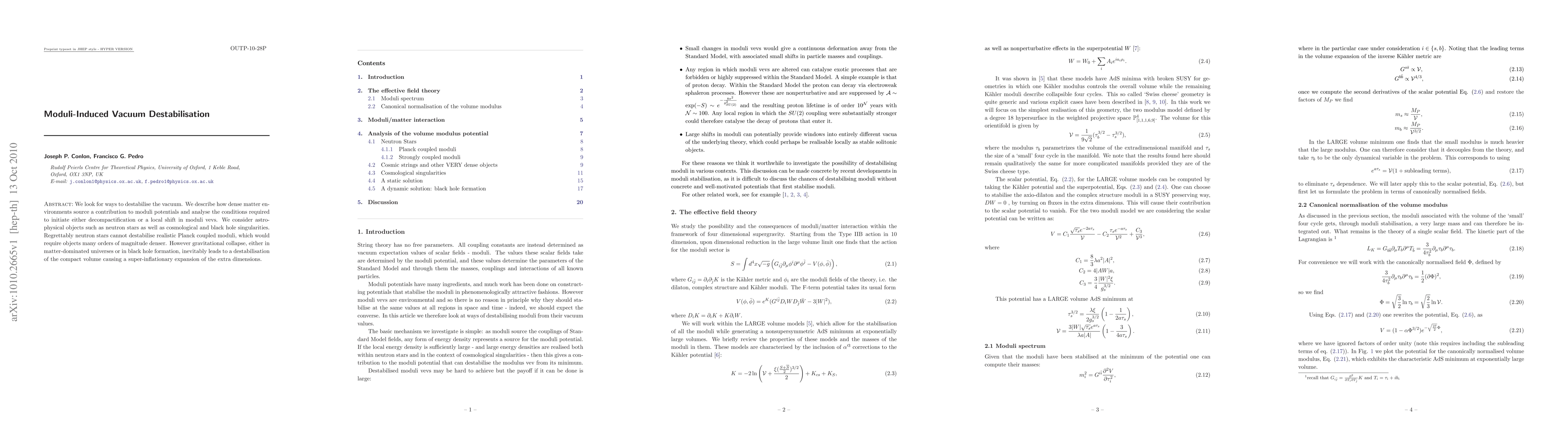 We look for ways to destabilise the vacuum. We describe how dense matter environments source a contribution to moduli potentials and analyse the conditions required to initiate either decompactification or a local shift in moduli vevs. We consider astrophysical objects such as neutron stars as well as cosmological and black hole singularities. Regrettably neutron stars cannot destabilise realistic Planck coupled moduli, which would require objects many orders of magnitude denser. However gravitational collapse, either in matter-dominated universes or in black hole formation, inevitably leads to a destabilisation of the compact volume causing a super-inflationary expansion of the extra dimensions.