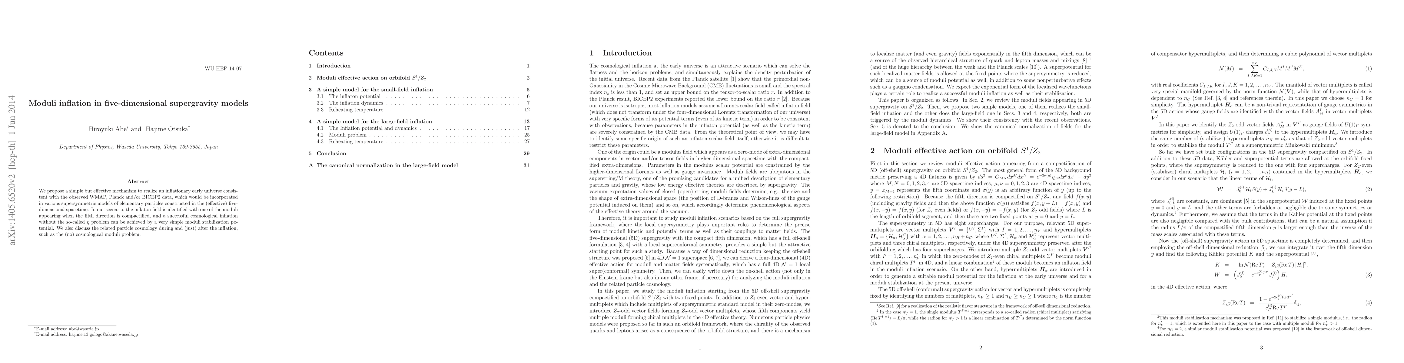 We propose a simple but effective mechanism to realize an inflationary early universe consistent with the observed WMAP, Planck and/or BICEP2 data, which would be incorporated in various supersymmetric models of elementary particles constructed in the (effective) five-dimensional spacetime. In our scenario, the inflaton field is identified with one of the moduli appearing when the fifth direction is compactified, and a successful cosmological inflation without the so-called eta problem can be achieved by a very simple moduli stabilization potential. We also discuss the related particle cosmology during and (just) after the inflation, such as the (no) cosmological moduli problem.