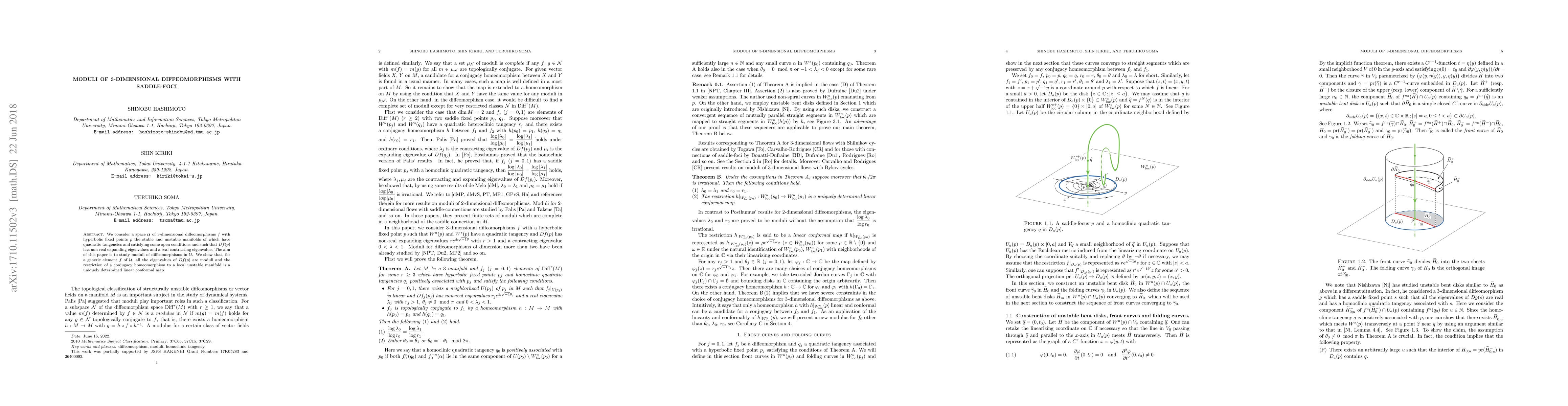 This paper investigates a space $\mathcal{U}$ of 3-dimensional diffeomorphisms with hyperbolic fixed points featuring quadratic tangencies and specific open conditions. It demonstrates that for generic elements in $\mathcal{U}$, all eigenvalues of the derivative at a fixed point are moduli, and the conjugacy homeomorphism to a local unstable manifold uniquely determines a linear conformal map.