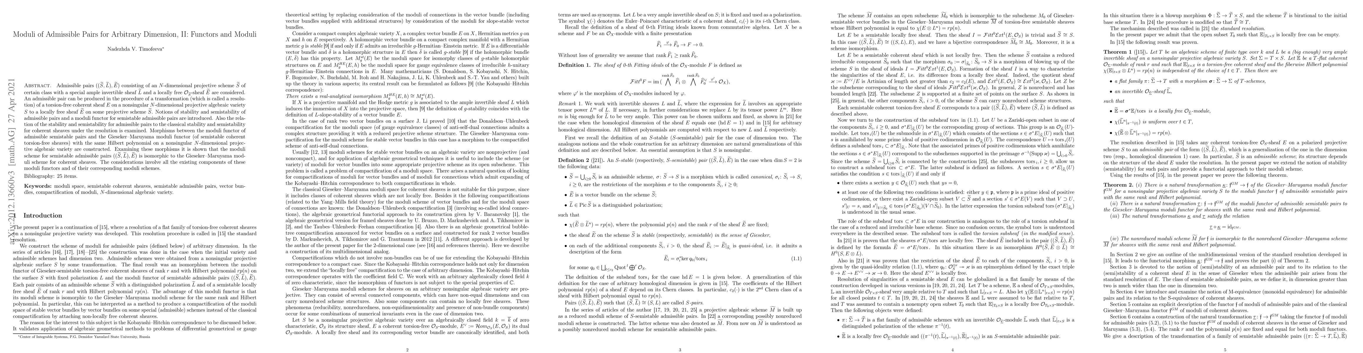 Admissible pairs $((\widetilde S, \widetilde L), \widetilde E)$ consisting of an $N$-dimensional projective scheme~$\widetilde S$ of certain class with a special ample invertible sheaf $\widetilde L$ and a locally free ${\cal O}_{\widetilde S}$-sheaf $\widetilde E$ are considered. An admissible pair can be produced in the procedure of a transformation (which is called a resolution) of a torsion-free coherent sheaf $E$ on a nonsingular $N$-dimensional projective algebraic variety $S$ to a locally free sheaf $\widetilde E$ on some projective scheme $\widetilde S$. Notions of stability and semistability of admissible pairs and a moduli functor for semistable admissible pairs are introduced. Also the relation of the stability and semistability for admissible pairs to the classical stability and semistability for coherent sheaves under the resolution is examined. Morphisms between the moduli functor of admissible semistable pairs and the Gieseker--Maruyama moduli functor (of semistable coherent torsion-free sheaves) with the same Hilbert polynomial on a nonsingular $N$-dimensional projective algebraic variety are constructed. Examining these morphisms it is shown that the moduli scheme for semistable admissible pairs $((\widetilde S, \widetilde L), \widetilde E)$ is isomorphic to the Gieseker--Maruyama moduli scheme for coherent sheaves. The considerations involve all the existing components of these moduli functors and of their corresponding moduli schemes. Bibliography: 25 items.