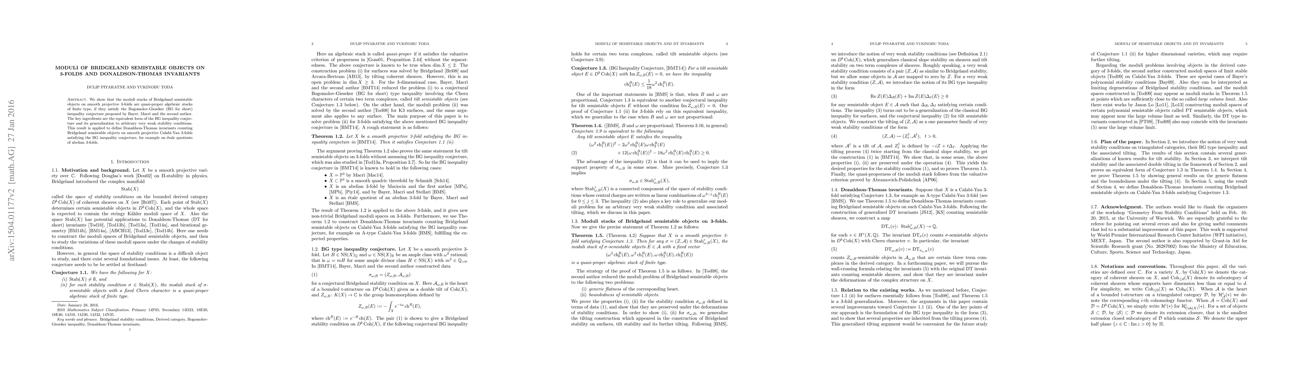 This paper demonstrates that moduli stacks of Bridgeland semistable objects on smooth projective 3-folds are proper algebraic stacks under the Bogomolov-Gieseker inequality, leading to the definition of Donaldson-Thomas invariants for such objects on Calabi-Yau 3-folds.