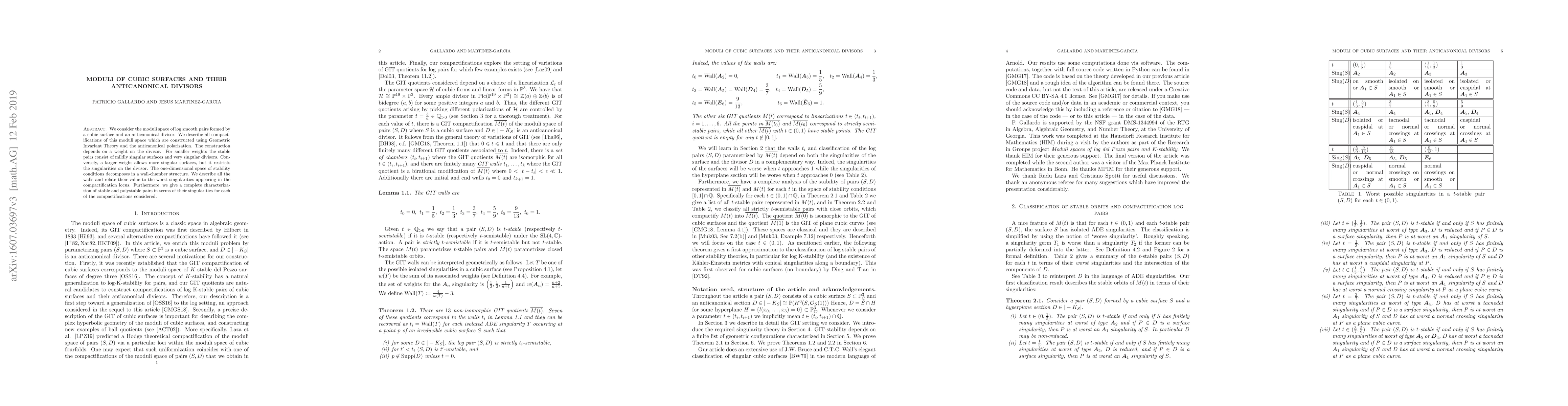 This paper studies the moduli space of cubic surfaces with anticanonical divisors, detailing various compactifications using Geometric Invariant Theory. It explores how weight influences the types of singularities allowed, and provides a complete characterization of stable and polystable pairs based on their singularities.