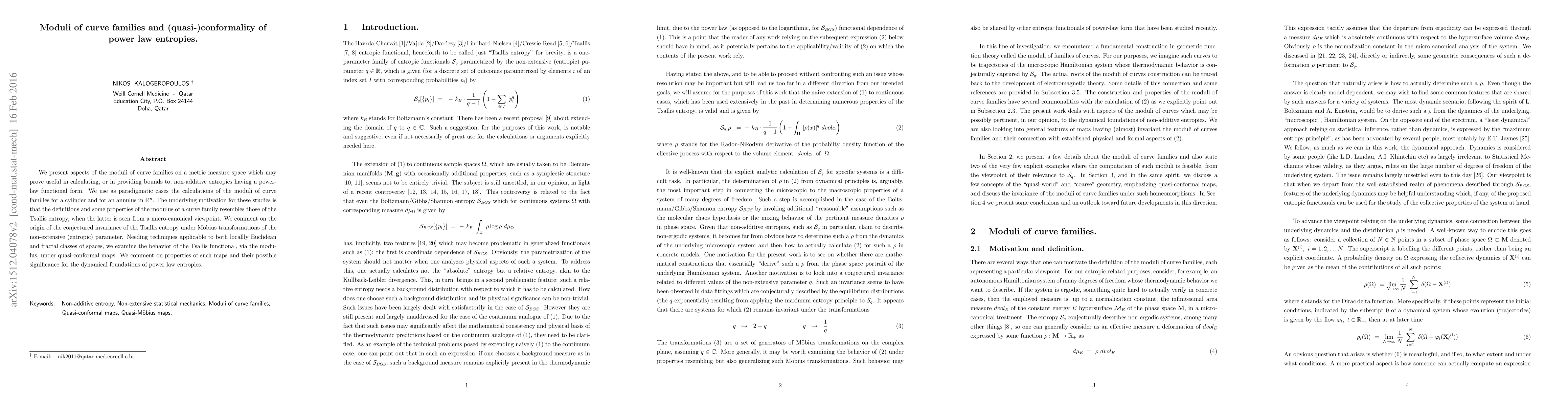 We present aspects of the moduli of curve families on a metric measure space which may prove useful in calculating, or in providing bounds to, non-additive entropies having a power-law functional form. We use as paradigmatic cases the calculations of the moduli of curve families for a cylinder and for an annulus in $\mathbb{R}^n$. The underlying motivation for these studies is that the definitions and some properties of the modulus of a curve family resembles those of the Tsallis entropy, when the latter is seen from a micro-canonical viewpoint. We comment on the origin of the conjectured invariance of the Tsallis entropy under M\"obius transformations of the non-extensive (entropic) parameter. Needing techniques applicable to both locallly Euclidean and fractal classes of spaces, we examine the behavior of the Tsallis functional, via the modulus, under quasi-conformal maps. We comment on properties of such maps and their possible significance for the dynamical foundations of power-law entropies.