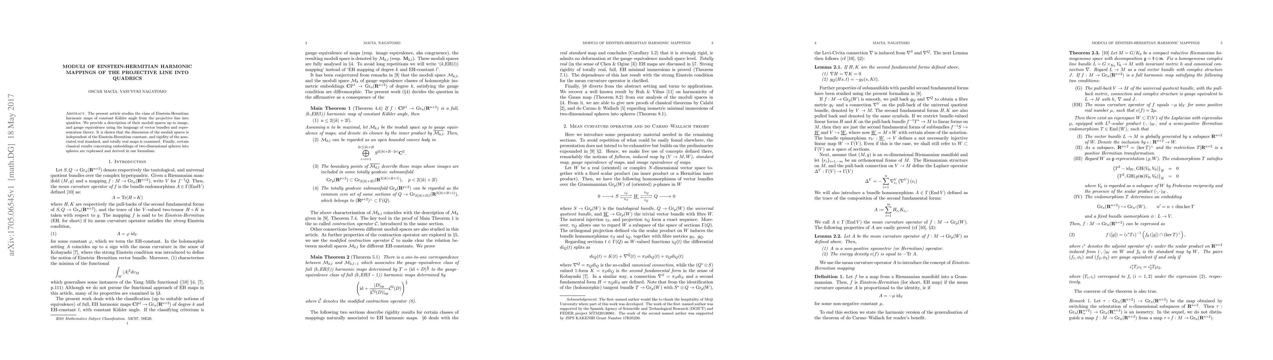 This paper investigates Einstein-Hermitian harmonic maps from the projective line into quadrics, describing their moduli spaces in terms of vector bundles and representation theory. It demonstrates that the moduli space's dimension is constant regardless of the Einstein-Hermitian constant, and examines the rigidity of related real and totally real maps, reinterpreting classical embedding results.