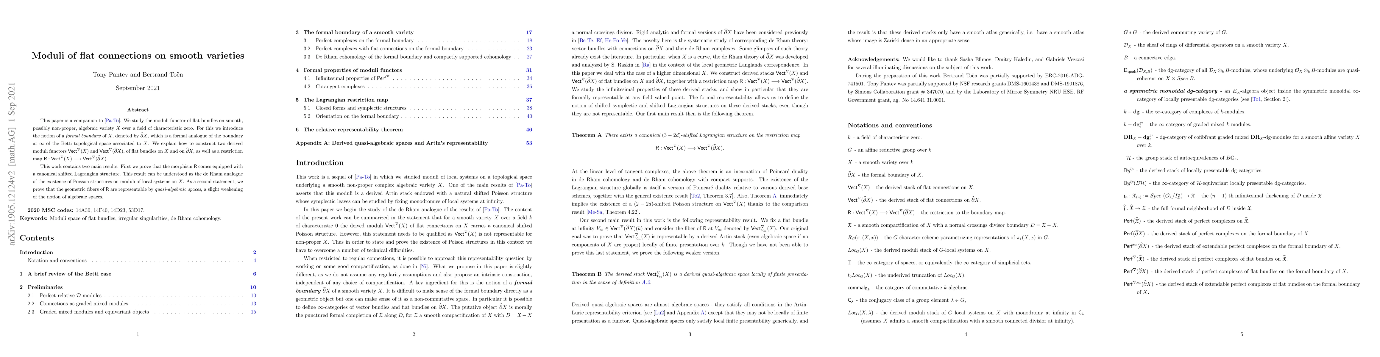 We study the moduli functor of flat bundles on smooth, possibly non-proper, algebraic variety $X$ (over a field of characteristic zero). For this we introduce the notion of \emph{formal boundary} of $X$, denoted by $\partial X$, which is a formal analogue of the boundary at infinity of the Betti topological space associated to $X$. We explain how to construct two derived moduli functors $Vect^{\nabla}(X)$ and $Vect^{\nabla}(\partial X)$, of flat bundles on $X$ and on $\partial X$, as well as a restriction map $R : Vect^{\nabla}(X) \rightarrow Vect^\nabla(\partial X)$ from the former to the later. This work contains two main results. First we prove that the morphism R comes equipped with a canonical shifted Lagrangian structure in the sense of [PTVV]. This first result can be understood as the de Rham analogue of the existence of Poisson structures on moduli of local systems previously studied by the authors. As a second statement, we prove that the geometric fibers of $R$ are representable by "quasi-algebraic spaces", a slight weakening of the notion of algebraic spaces.