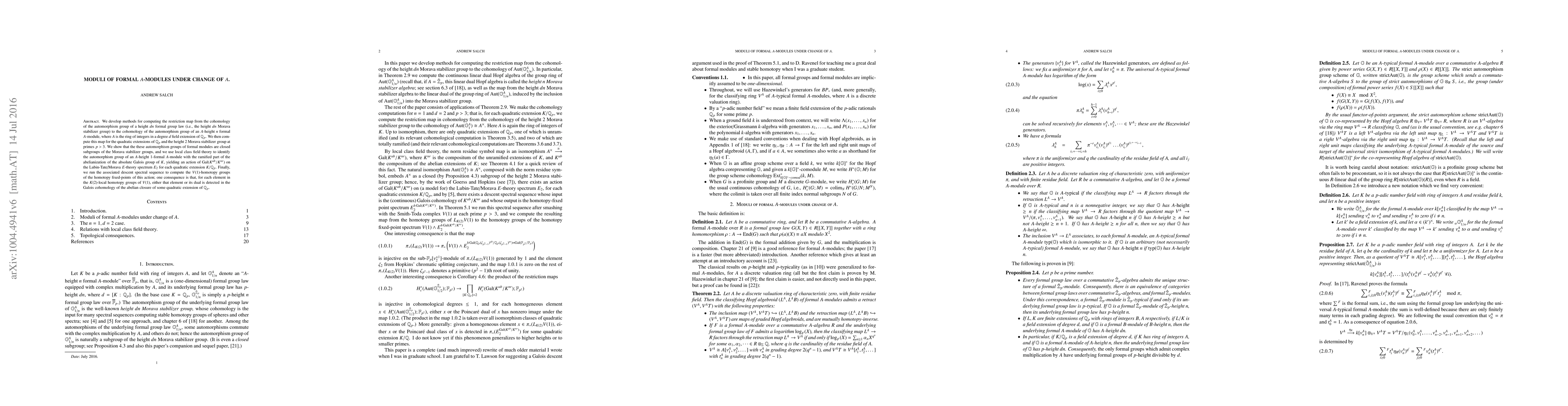 This paper develops methods to compute the restriction map between the cohomologies of automorphism groups of formal group laws and modules under changes in the base ring, focusing on quadratic extensions of $\mathbb{Q}_p$. It establishes the automorphism groups of formal modules as closed subgroups of Morava stabilizer groups and uses local class field theory to relate them to Galois groups, ultimately computing $V(1)$-homotopy groups.