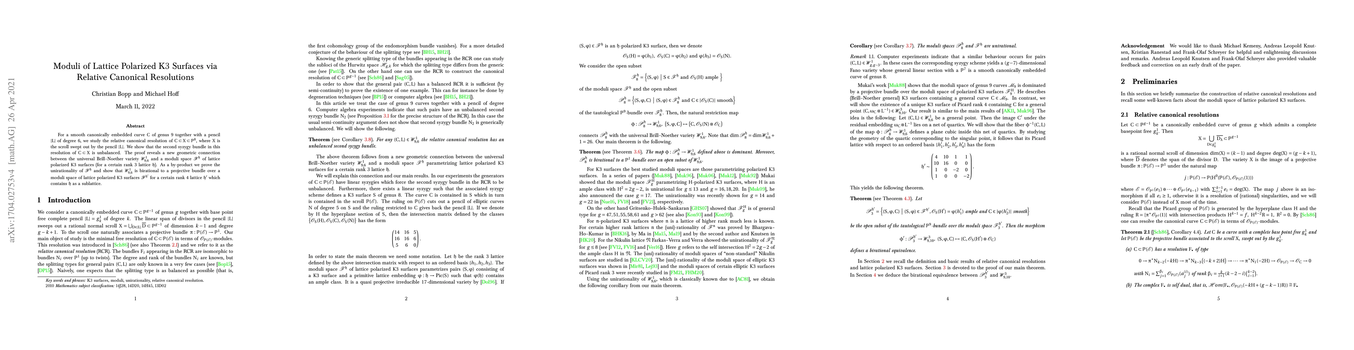 For a smooth canonically embedded curve $C$ of genus $9$ together with a pencil $|L|$ of degree $6$, we study the relative canonical resolution of $C\subset X\subset \mathbb{P}^8$, where $X$ is the scroll swept out by the pencil $|L|$. We show that the second syzygy bundle in this resolution of $C\subset X$ is unbalanced. The proof reveals a new geometric connection between the universal Brill--Noether variety $\mathcal{W}^1_{9,6}$ and a moduli space $\mathcal{F}^\mathfrak{h}$ of lattice polarized $K3$ surfaces (for a certain rank $3$ lattice $\mathfrak{h}$). As a by-product we prove the unirationality of $\mathcal{F}^\mathfrak{h}$ and show that $\mathcal{W}^1_{9,6}$ is birational to a projective bundle over a moduli space of lattice polarized $K3$ surfaces $\mathcal{F}^{\mathfrak{h}'}$ for a certain rank $4$ lattice $\mathfrak{h}'$ which contains $\mathfrak{h}$ as a sublattice.