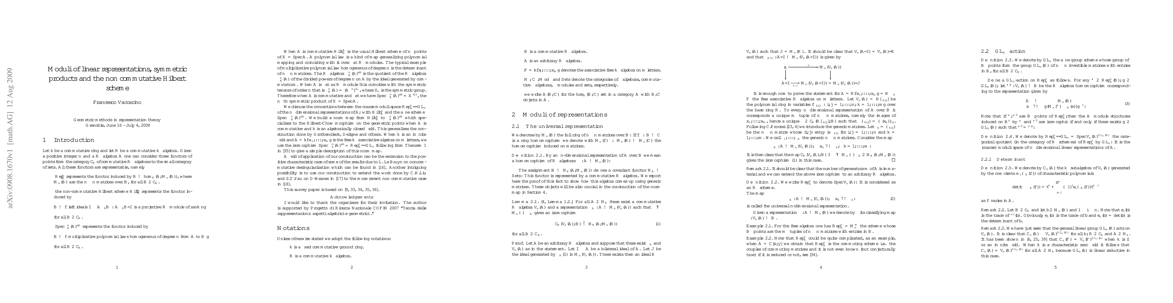 In this survey paper we study the relationships between the coarse moduli space which parameterizes the finite dimensional linear representations of an associative alegebra, the non commutative hilbert scheme and the affine scheme which is the spectrum of the abelianization of algebra of the divided powers. In particular we will show a map which specialize to the Hlibert - Chow morphism when the associative algebra is commutative. The extension to the positive characteristic case of some of the results due to L. Le Bruyn on noncommutative desingularization is outlined. The possibility to use our construction to extend the work done by C.H.Liu and S.T.Yau on D-Branes to their more recent work on non commutative case is underlined.