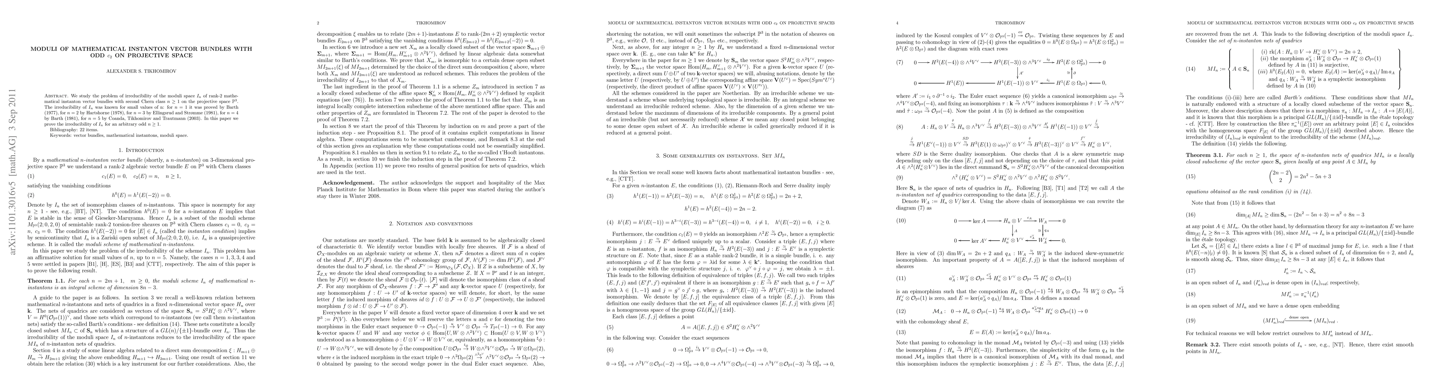 This paper proves the irreducibility of the moduli space I_n for rank-2 mathematical instanton vector bundles with odd positive second Chern class n on projective 3-space, extending previous results that were known only for small odd values of n.