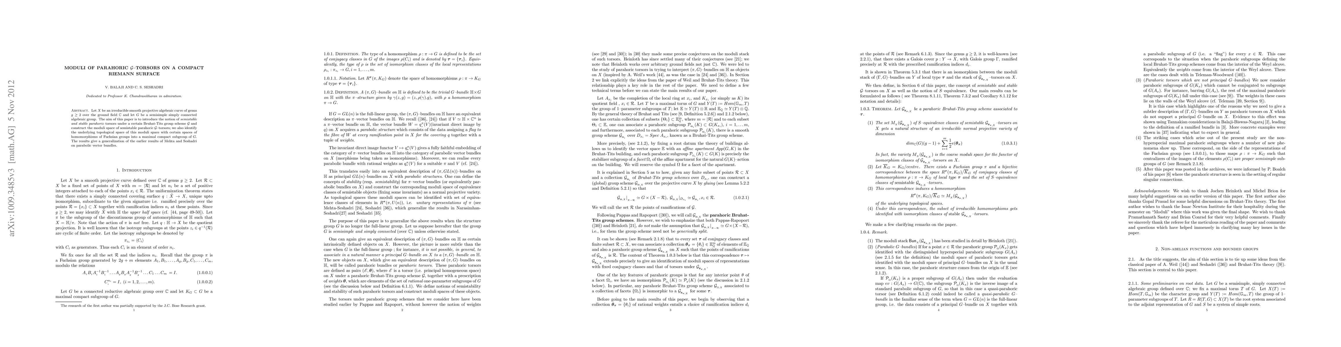 Let $X$ be an irreducible smooth projective algebraic curve of genus $g \geq 2$ over the ground field $\bc$ and let $G$ be a semisimple simply connected algebraic group. The aim of this paper is to introduce the notion of semistable and stable parahoric torsors under a certain Bruhat-Tits group scheme $\mathcal G$ and construct the moduli space of semistable parahoric $\mathcal G$--torsors; we also identify the underlying topological space of this moduli space with certain spaces of homomorphisms of Fuchsian groups into a maximal compact subgroup of $G$. The results give a generalization of the earlier results of Mehta and Seshadri on parabolic vector bundles. This is the final version of the accepted paper.