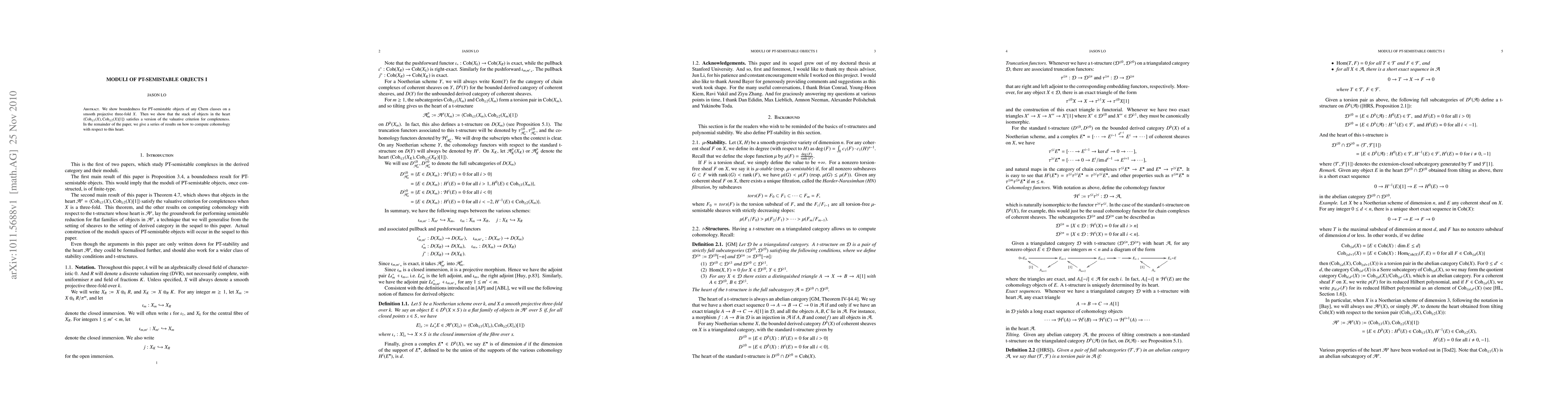 We show boundedness for PT-semistable objects of any Chern classes on a smooth projective three-fold $X$. Then we show that the stack of objects in the heart $\langle \Coh_{\leq 1}(X), \Coh_{\geq 2}(X)[1] \rangle$ satisfies a version of the valuative criterion for completeness. In the remainder of the paper, we give a series of results on how to compute cohomology with respect to this heart.