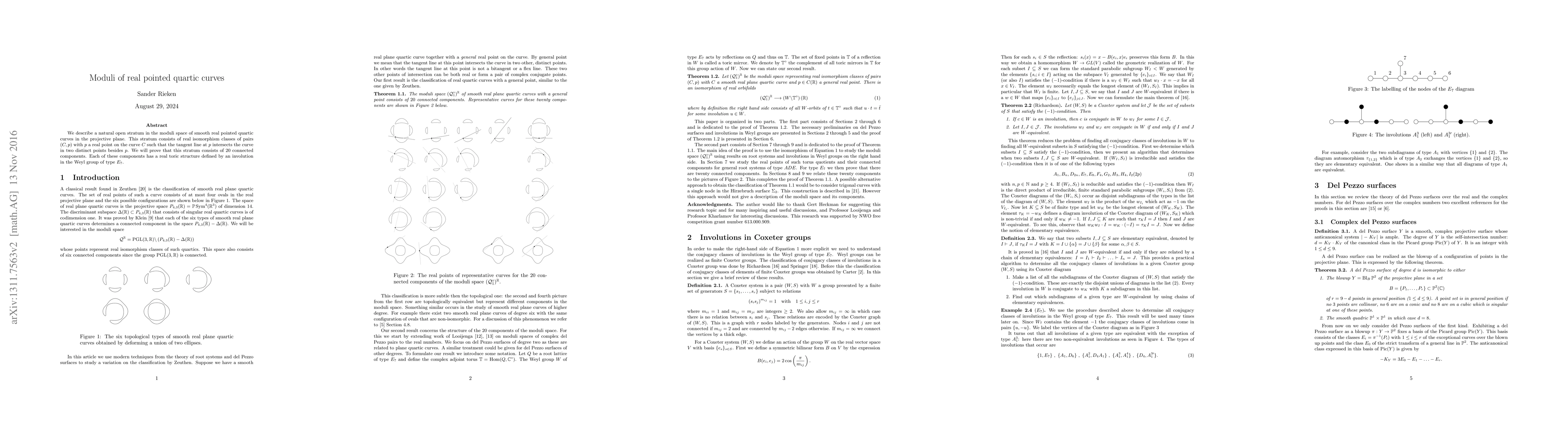 This paper explores an open stratum in the moduli space of smooth real pointed quartic curves, demonstrating that it consists of 20 connected components, each with a real toric structure defined by an involution in the Weyl group of type $E_7$.
