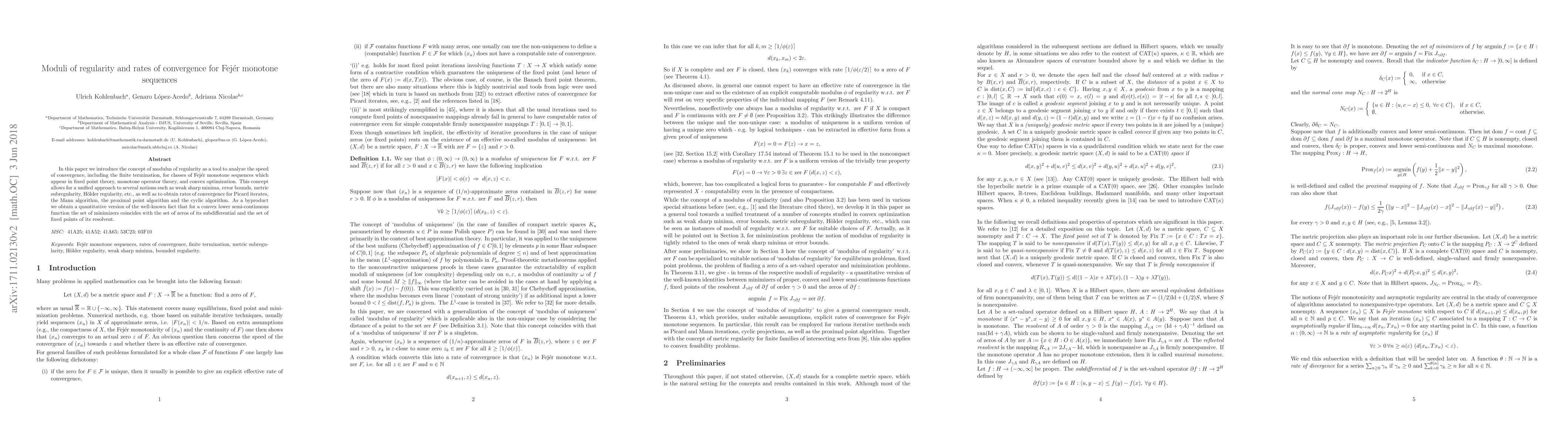 The paper introduces the concept of modulus of regularity to analyze the speed of convergence for Fejér monotone sequences, unifying various notions such as weak sharp minima, error bounds, metric subregularity, and Hölder regularity. It provides rates of convergence for Picard iterates, the Mann algorithm, the proximal point algorithm, and the cyclic algorithm.
