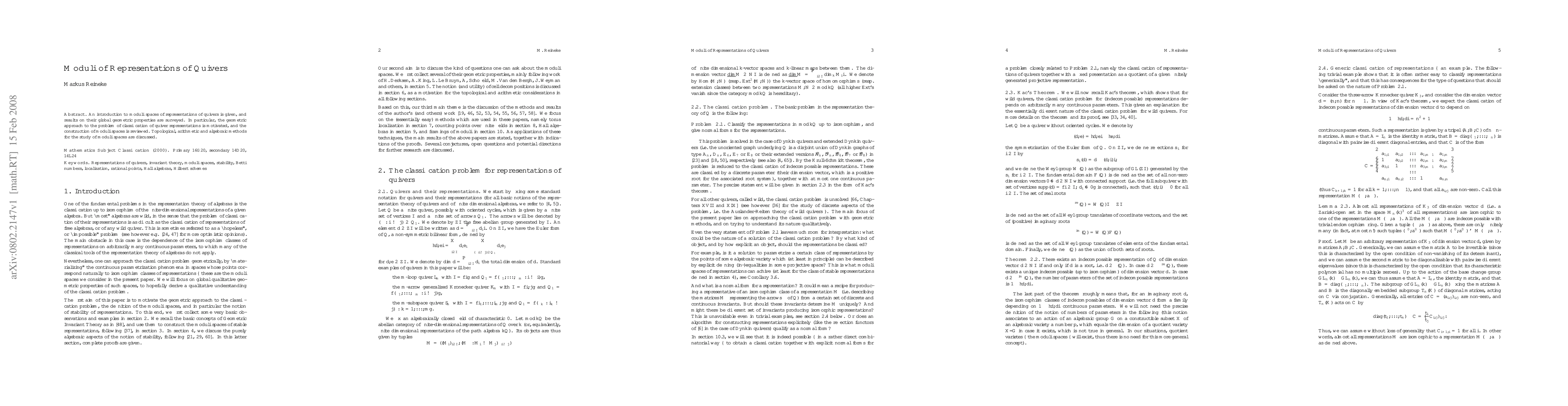 This paper introduces and surveys the global geometric properties of moduli spaces of representations of quivers, emphasizing the geometric classification approach and reviewing their construction, alongside topological, arithmetic, and algebraic study methods.