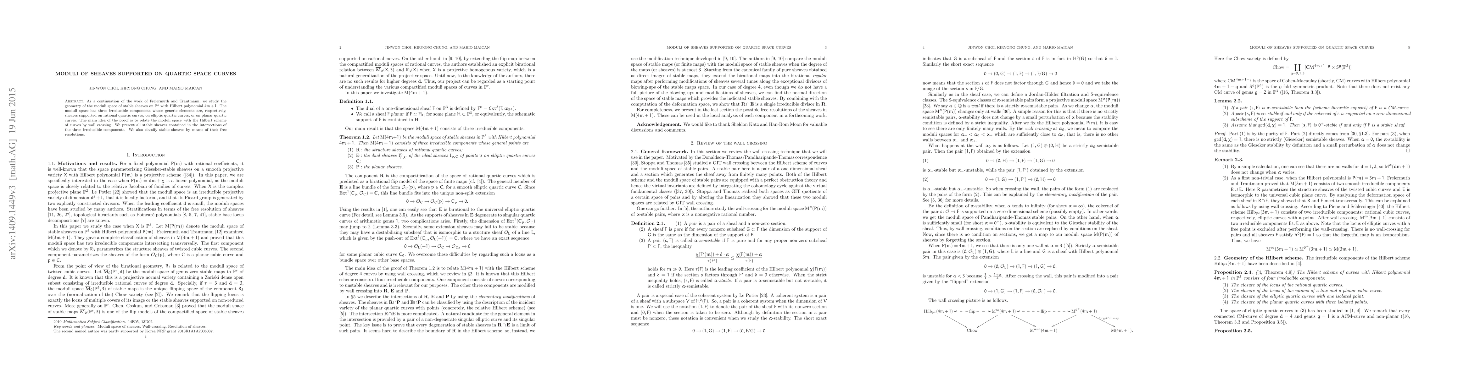 The paper studies the moduli space of stable sheaves on $\mathbb{P}^3$ with a specific Hilbert polynomial, identifying three irreducible components corresponding to sheaves on different types of quartic curves. The analysis employs wall crossing techniques linked to the Hilbert scheme of curves to classify these sheaves and their intersections.