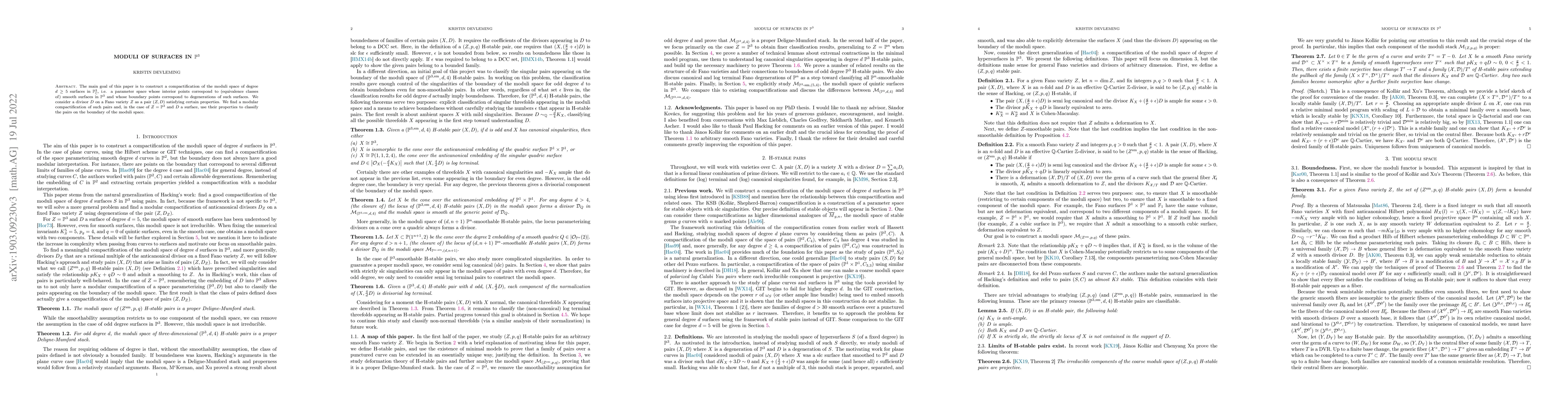 This paper constructs a compactification for the moduli space of degree $d \ge 5$ surfaces in $\mathbb{P}^3$, including smooth surfaces and their degenerations. It also generalizes the problem to pairs $(Z, D)$ on Fano varieties, providing a modular compactification and classifying boundary pairs for $Z = \mathbb{P}^3$ and $D$ as a surface.