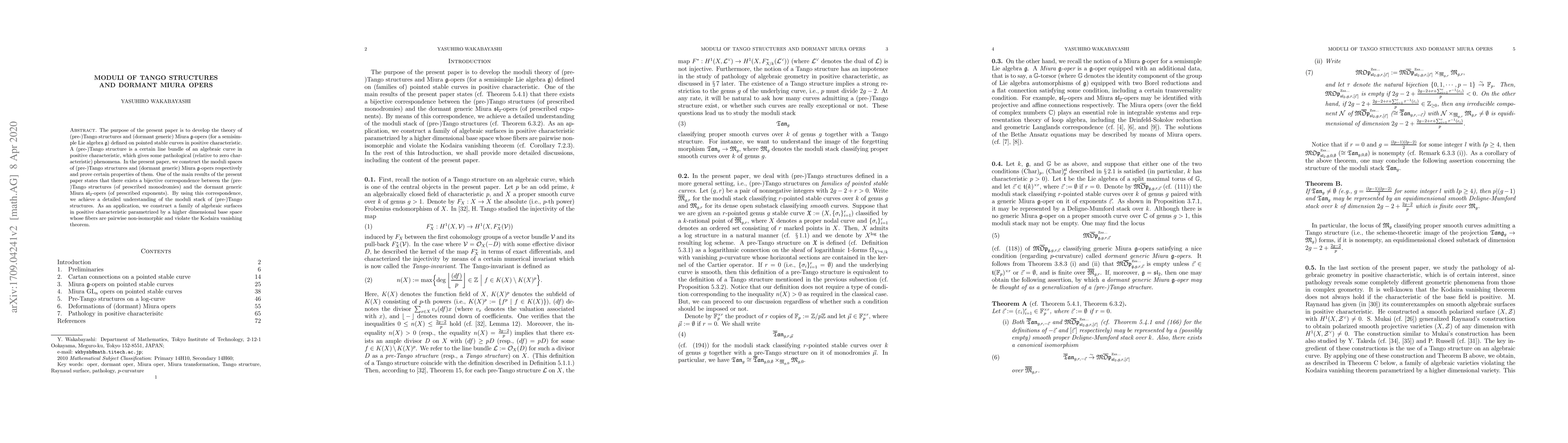 This paper develops the theory of (pre-)Tango structures and dormant Miura $\mathfrak{g}$-opers on pointed stable curves in positive characteristic, constructing their moduli spaces and proving properties. The main result establishes a bijective correspondence between (pre-)Tango structures and dormant generic Miura $\mathfrak{s} \mathfrak{l}_2$-opers, leading to a deeper understanding of the moduli stack of (pre-)Tango structures and constructing non-isomorphic algebraic surfaces violating the Kodaira vanishing theorem.
