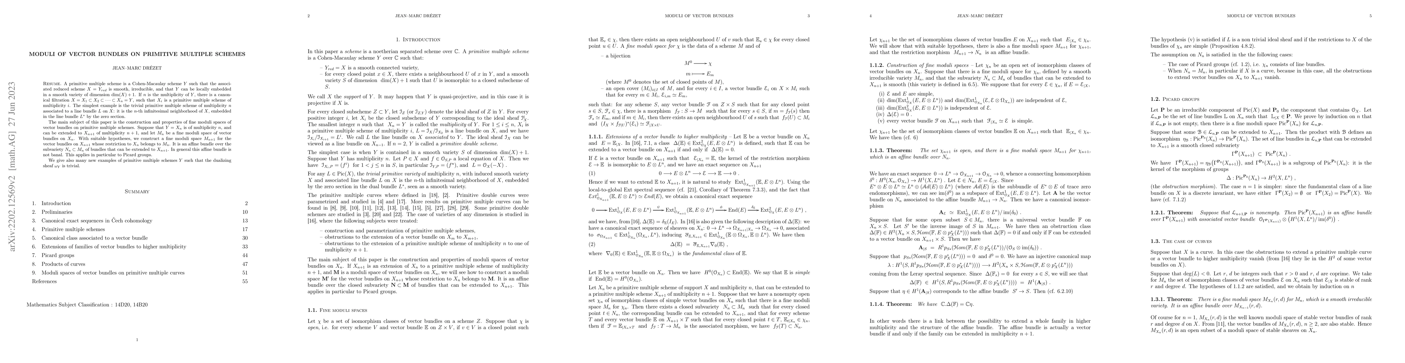 A primitive multiple scheme is a Cohen-Macaulay scheme $Y$ such that the associated reduced scheme $X=Y_{red}$ is smooth, irreducible, and that $Y$ can be locally embedded in a smooth variety of dimension $\dim(X)+1$. If $n$ is the multiplicity of $Y$, there is a canonical filtration $X=X_1\subset X_2\subset\cdots\subset X_n=Y$, such that $X_i$ is a primitive multiple scheme of multiplicity $i$. The simplest example is the trivial primitive multiple scheme of multiplicity $n$ associated to a line bundle $L$ on $X$: it is the $n$-th infinitesimal neighborhood of $X$, embedded in the line bundle $L^*$ by the zero section. The main subject of this paper is the construction and properties of fine moduli spaces of vector bundles on primitive multiple schemes. Suppose that $Y=X_n$ is of multiplicity $n$, and can be extended to $X_{n+1}$ of multiplicity $n+1$, and let $M_n$ a fine moduli space of vector bundles on $X_n$. With suitable hypotheses, we construct a fine moduli space $M_{n+1}$ for the vector bundles on $X_{n+1}$ whose restriction to $X_n$ belongs to $M_n$. It is an affine bundle over the subvariety $N_n\subset M_n$ of bundles that can be extended to $X_{n+1}$. In general this affine bundle is not banal. This applies in particular to Picard groups. We give also many new examples of primitive multiple schemes $Y$ such that the dualizing sheaf $\omega_Y$ is trivial.